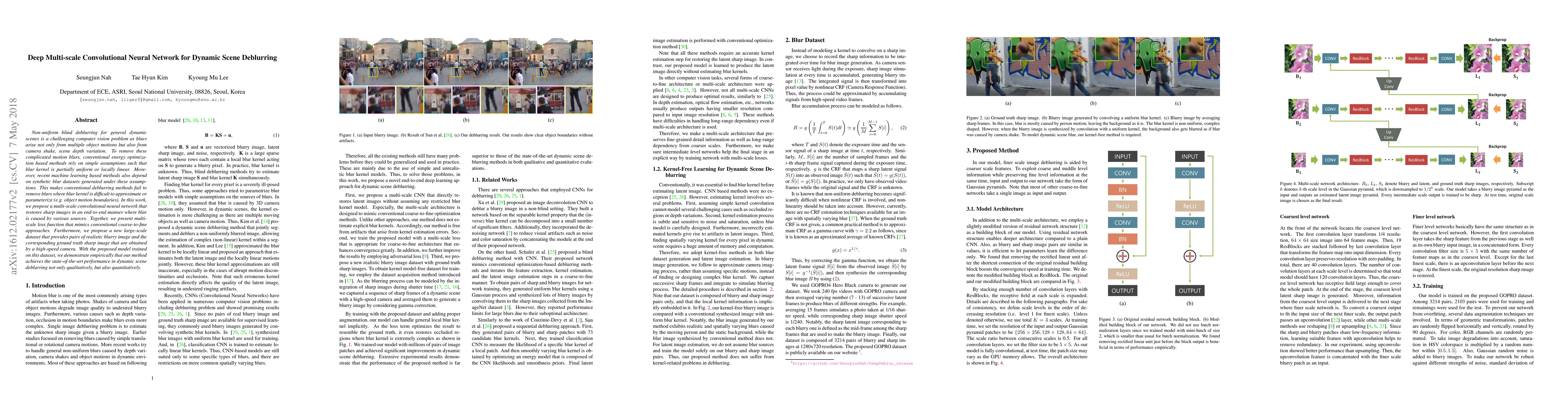 This paper proposes a deep multi-scale convolutional neural network for dynamic scene deblurring, addressing non-uniform blind deblurring challenges. The model achieves state-of-the-art performance by employing an end-to-end training approach and a new large-scale dataset of realistic blurry images.
