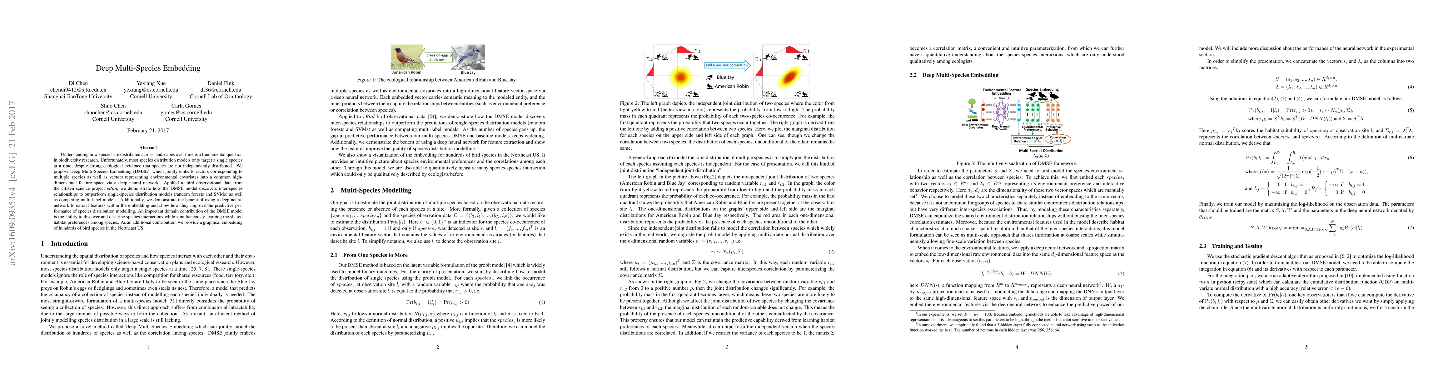 The Deep Multi-Species Embedding (DMSE) model jointly embeds multiple species and environmental covariates into a common feature space, revealing inter-species relationships and improving species distribution predictions over single-species models. The DMSE model also highlights shared habitat preferences and provides a graphical embedding of bird species in the Northeast US.