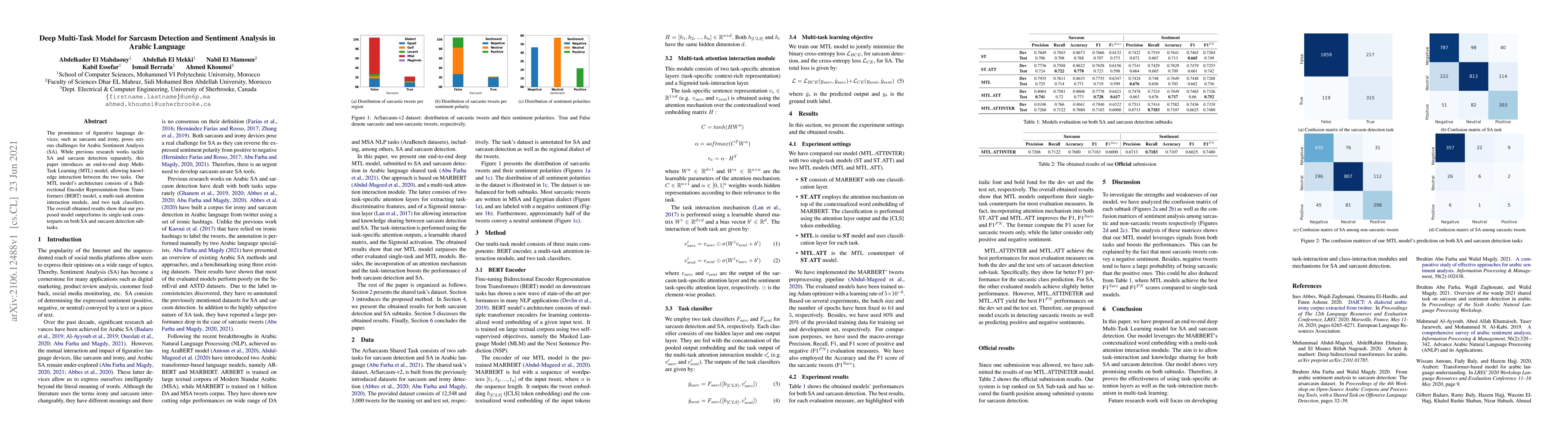 This paper presents a deep Multi-Task Learning model that integrates sarcasm detection and sentiment analysis for the Arabic language, achieving superior performance compared to single-task models through knowledge sharing between the two tasks. The proposed model uses BERT for representation, a multi-task attention module, and task classifiers.