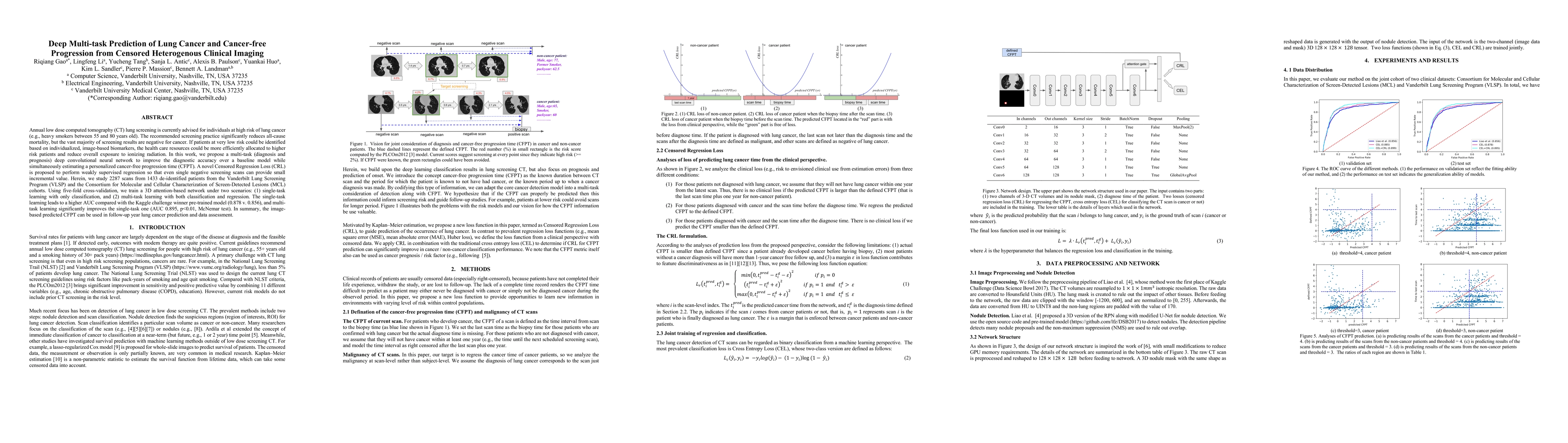 Annual low dose computed tomography (CT) lung screening is currently advised for individuals at high risk of lung cancer (e.g., heavy smokers between 55 and 80 years old). The recommended screening practice significantly reduces all-cause mortality, but the vast majority of screening results are negative for cancer. If patients at very low risk could be identified based on individualized, image-based biomarkers, the health care resources could be more efficiently allocated to higher risk patients and reduce overall exposure to ionizing radiation. In this work, we propose a multi-task (diagnosis and prognosis) deep convolutional neural network to improve the diagnostic accuracy over a baseline model while simultaneously estimating a personalized cancer-free progression time (CFPT). A novel Censored Regression Loss (CRL) is proposed to perform weakly supervised regression so that even single negative screening scans can provide small incremental value. Herein, we study 2287 scans from 1433 de-identified patients from the Vanderbilt Lung Screening Program (VLSP) and Molecular Characterization Laboratories (MCL) cohorts. Using five-fold cross-validation, we train a 3D attention-based network under two scenarios: (1) single-task learning with only classification, and (2) multi-task learning with both classification and regression. The single-task learning leads to a higher AUC compared with the Kaggle challenge winner pre-trained model (0.878 v. 0.856), and multi-task learning significantly improves the single-task one (AUC 0.895, p<0.01, McNemar test). In summary, the image-based predicted CFPT can be used in follow-up year lung cancer prediction and data assessment.