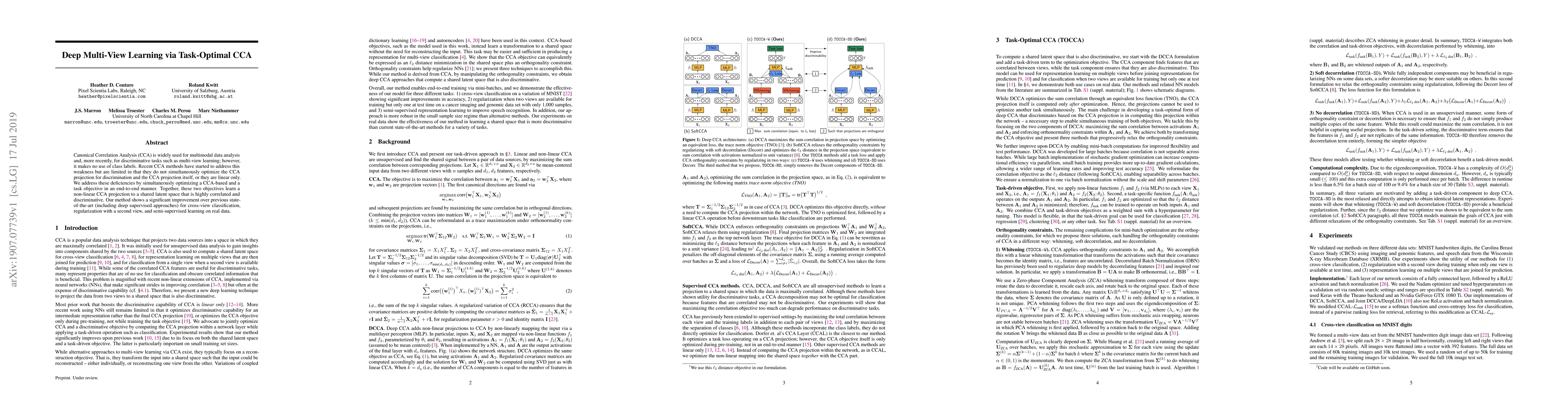 This paper proposes a novel deep multi-view learning method that optimizes both Canonical Correlation Analysis (CCA) and task-specific objectives to enhance discriminative power. The method achieves significant improvements over existing approaches in cross-view classification, regularization, and semi-supervised learning.