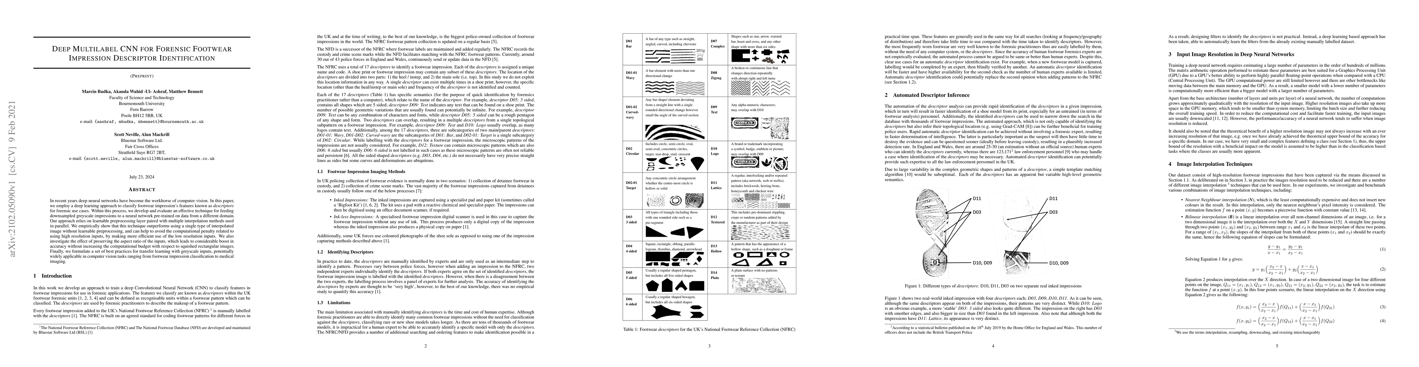 In recent years deep neural networks have become the workhorse of computer vision. In this paper, we employ a deep learning approach to classify footwear impression's features known as \emph{descriptors} for forensic use cases. Within this process, we develop and evaluate an effective technique for feeding downsampled greyscale impressions to a neural network pre-trained on data from a different domain. Our approach relies on learnable preprocessing layer paired with multiple interpolation methods used in parallel. We empirically show that this technique outperforms using a single type of interpolated image without learnable preprocessing, and can help to avoid the computational penalty related to using high resolution inputs, by making more efficient use of the low resolution inputs. We also investigate the effect of preserving the aspect ratio of the inputs, which leads to considerable boost in accuracy without increasing the computational budget with respect to squished rectangular images. Finally, we formulate a set of best practices for transfer learning with greyscale inputs, potentially widely applicable in computer vision tasks ranging from footwear impression classification to medical imaging.