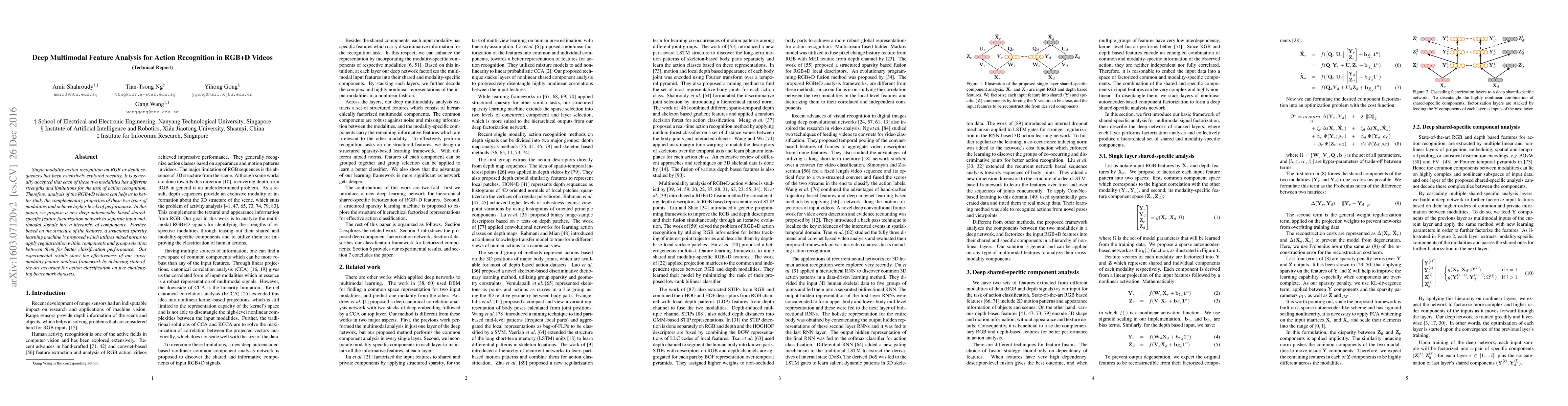 This paper proposes a deep autoencoder network for analyzing multimodal features in RGB+D videos to enhance action recognition. It introduces a shared-specific feature factorization approach and a structured sparsity learning machine for better classification, achieving top performance on benchmark datasets.