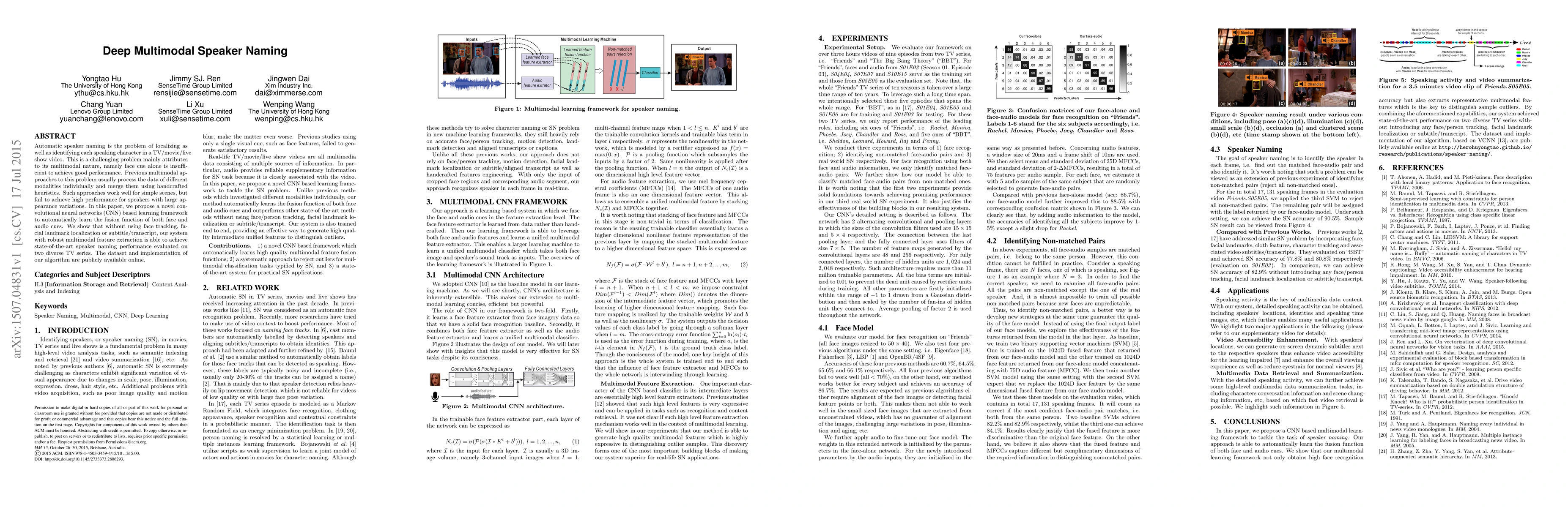 This paper proposes a CNN-based framework for automatic speaker naming in video, leveraging both face and audio cues for robust multimodal feature extraction. The approach achieves state-of-the-art performance without reliance on face tracking or transcripts, demonstrating high accuracy in diverse TV series.