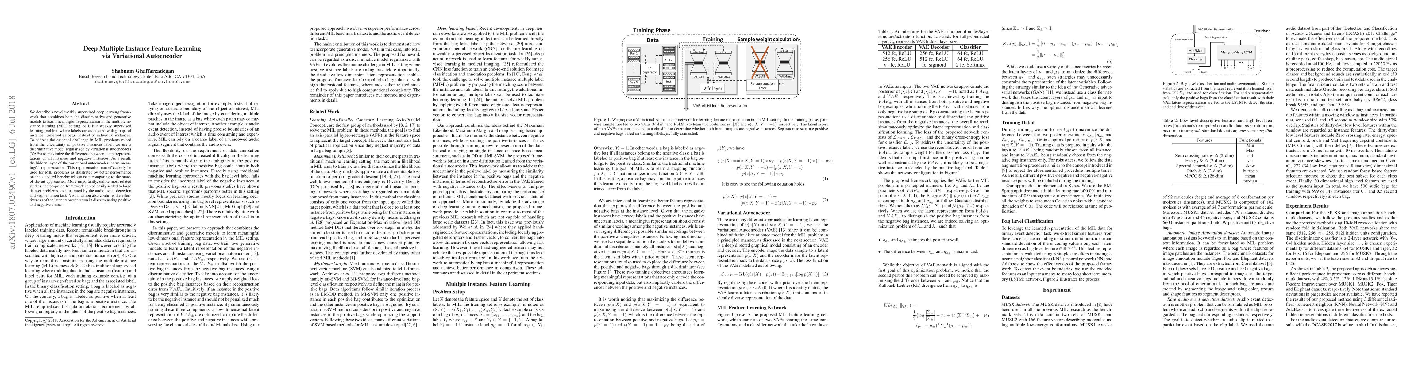 We describe a novel weakly supervised deep learning framework that combines both the discriminative and generative models to learn meaningful representation in the multiple instance learning (MIL) setting. MIL is a weakly supervised learning problem where labels are associated with groups of instances (referred as bags) instead of individual instances. To address the essential challenge in MIL problems raised from the uncertainty of positive instances label, we use a discriminative model regularized by variational autoencoders (VAEs) to maximize the differences between latent representations of all instances and negative instances. As a result, the hidden layer of the variational autoencoder learns meaningful representation. This representation can effectively be used for MIL problems as illustrated by better performance on the standard benchmark datasets comparing to the state-of-the-art approaches. More importantly, unlike most related studies, the proposed framework can be easily scaled to large dataset problems, as illustrated by the audio event detection and segmentation task. Visualization also confirms the effectiveness of the latent representation in discriminating positive and negative classes.