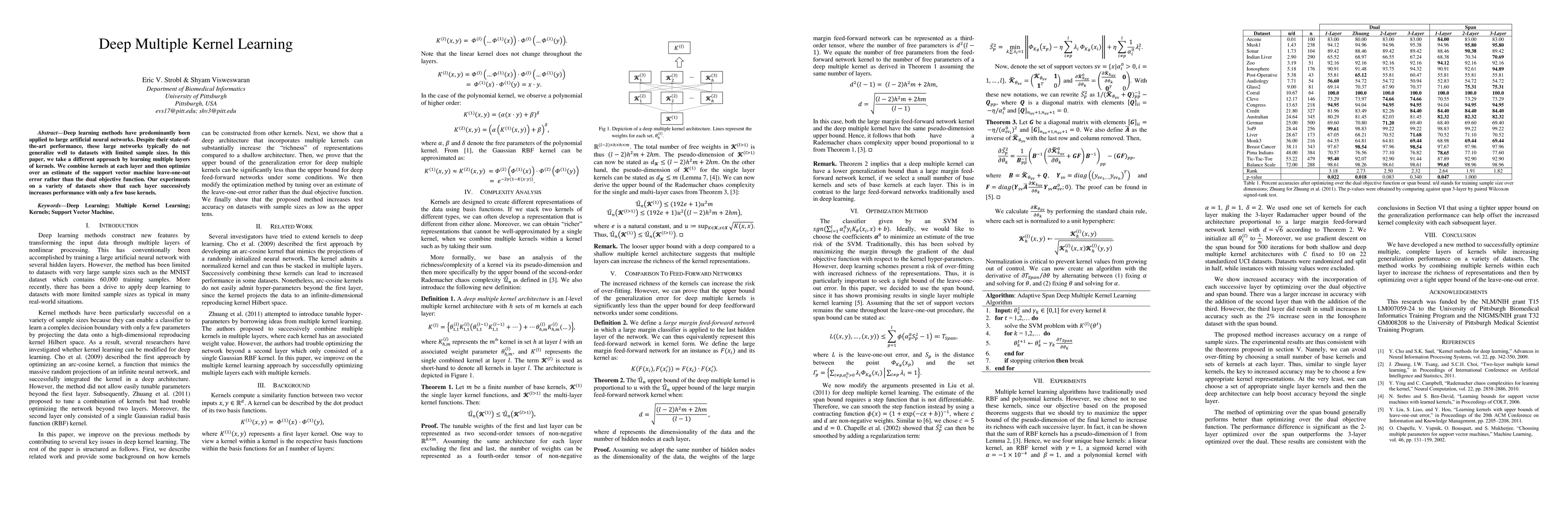 Deep learning methods have predominantly been applied to large artificial neural networks. Despite their state-of-the-art performance, these large networks typically do not generalize well to datasets with limited sample sizes. In this paper, we take a different approach by learning multiple layers of kernels. We combine kernels at each layer and then optimize over an estimate of the support vector machine leave-one-out error rather than the dual objective function. Our experiments on a variety of datasets show that each layer successively increases performance with only a few base kernels.