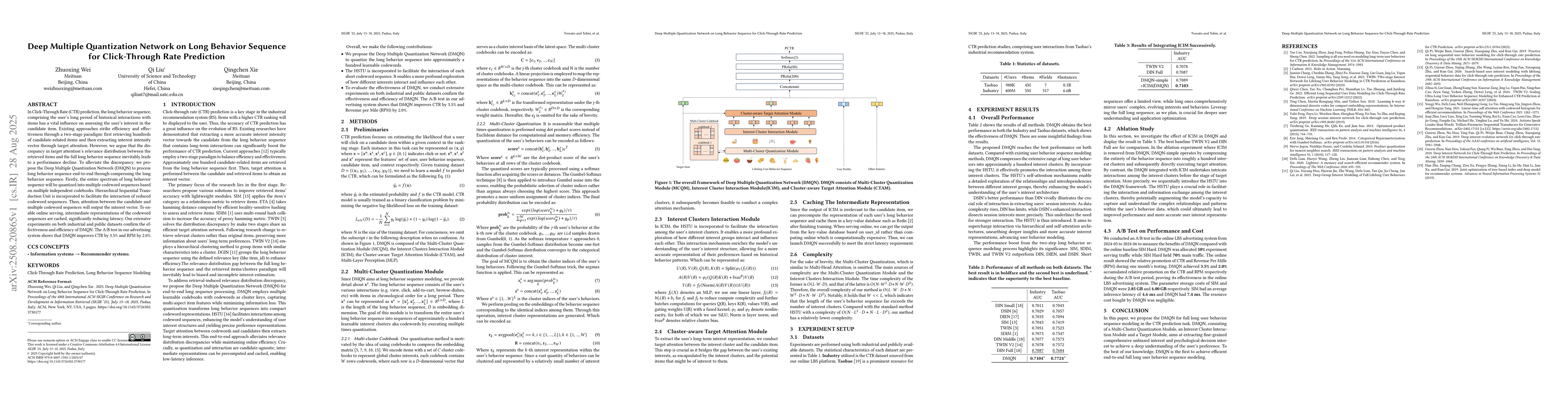In Click-Through Rate (CTR) prediction, the long behavior sequence, comprising the user's long period of historical interactions with items has a vital influence on assessing the user's interest in the candidate item. Existing approaches strike efficiency and effectiveness through a two-stage paradigm: first retrieving hundreds of candidate-related items and then extracting interest intensity vector through target attention. However, we argue that the discrepancy in target attention's relevance distribution between the retrieved items and the full long behavior sequence inevitably leads to a performance decline. To alleviate the discrepancy, we propose the Deep Multiple Quantization Network (DMQN) to process long behavior sequence end-to-end through compressing the long behavior sequence. Firstly, the entire spectrum of long behavior sequence will be quantized into multiple codeword sequences based on multiple independent codebooks. Hierarchical Sequential Transduction Unit is incorporated to facilitate the interaction of reduced codeword sequences. Then, attention between the candidate and multiple codeword sequences will output the interest vector. To enable online serving, intermediate representations of the codeword sequences are cached, significantly reducing latency. Our extensive experiments on both industrial and public datasets confirm the effectiveness and efficiency of DMQN. The A/B test in our advertising system shows that DMQN improves CTR by 3.5% and RPM by 2.0%.