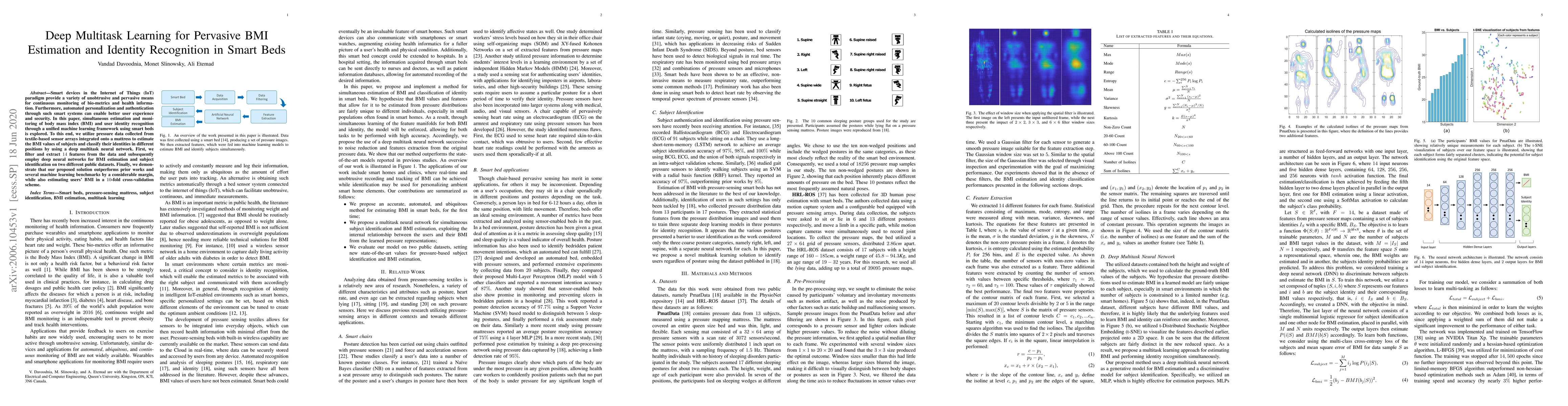 Smart devices in the Internet of Things (IoT) paradigm provide a variety of unobtrusive and pervasive means for continuous monitoring of bio-metrics and health information. Furthermore, automated personalization and authentication through such smart systems can enable better user experience and security. In this paper, simultaneous estimation and monitoring of body mass index (BMI) and user identity recognition through a unified machine learning framework using smart beds is explored. To this end, we utilize pressure data collected from textile-based sensor arrays integrated onto a mattress to estimate the BMI values of subjects and classify their identities in different positions by using a deep multitask neural network. First, we filter and extract 14 features from the data and subsequently employ deep neural networks for BMI estimation and subject identification on two different public datasets. Finally, we demonstrate that our proposed solution outperforms prior works and several machine learning benchmarks by a considerable margin, while also estimating users' BMI in a 10-fold cross-validation scheme.