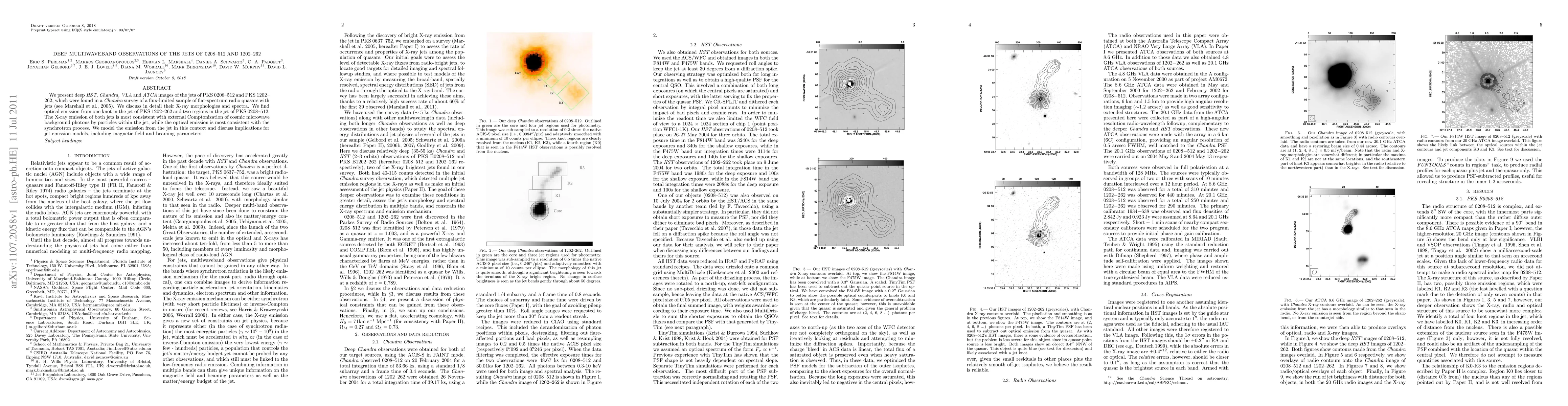We present deep {\it HST, Chandra, VLA} and {\it ATCA} images of the jets of PKS 0208--512 and PKS 1202--262, which were found in a {\it Chandra} survey of a flux-limited sample of flat-spectrum radio quasars with jets (see Marshall et al., 2005). We discuss in detail their X-ray morphologies and spectra. We find optical emission from one knot in the jet of PKS 1202--262 and two regions in the jet of PKS 0208--512. The X-ray emission of both jets is most consistent with external Comptonization of cosmic microwave background photons by particles within the jet, while the optical emission is most consistent with the synchrotron process. We model the emission from the jet in this context and discuss implications for jet emission models, including magnetic field and beaming parameters.