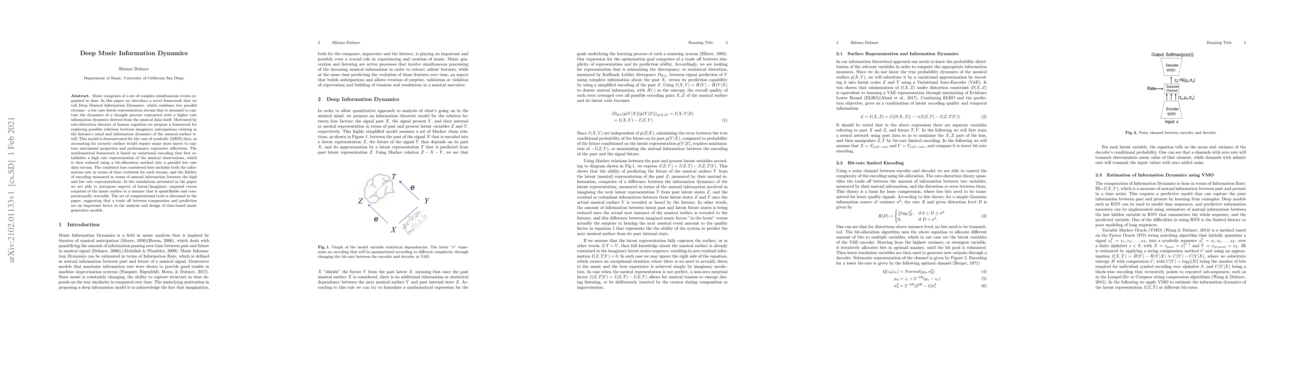 Music comprises of a set of complex simultaneous events organized in time. In this paper we introduce a novel framework that we call Deep Musical Information Dynamics, which combines two parallel streams - a low rate latent representation stream that is assumed to capture the dynamics of a thought process contrasted with a higher rate information dynamics derived from the musical data itself. Motivated by rate-distortion theories of human cognition we propose a framework for exploring possible relations between imaginary anticipations existing in the listener's mind and information dynamics of the musical surface itself. This model is demonstrated for the case of symbolic (MIDI) data, as accounting for acoustic surface would require many more layers to capture instrument properties and performance expressive inflections. The mathematical framework is based on variational encoding that first establishes a high rate representation of the musical observations, which is then reduced using a bit-allocation method into a parallel low rate data stream. The combined loss considered here includes both the information rate in terms of time evolution for each stream, and the fidelity of encoding measured in terms of mutual information between the high and low rate representations. In the simulations presented in the paper we are able to juxtapose aspects of latent/imaginary surprisal versus surprisal of the music surface in a manner that is quantifiable and computationally tractable. The set of computational tools is discussed in the paper, suggesting that a trade off between compression and prediction are an important factor in the analysis and design of time-based music generative models.