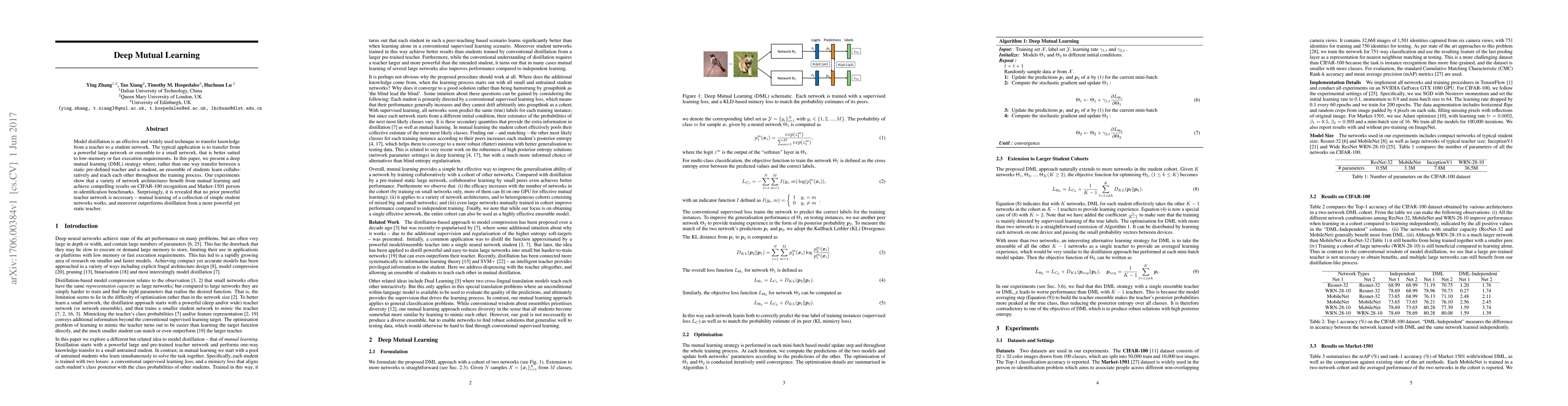 Deep Mutual Learning (DML) employs an ensemble of student networks that collaboratively learn and teach each other, achieving better results than traditional one-way distillation from a static teacher. Experiments demonstrate superior performance on CIFAR-100 and Market-1501 benchmarks, even without a powerful pre-defined teacher network.