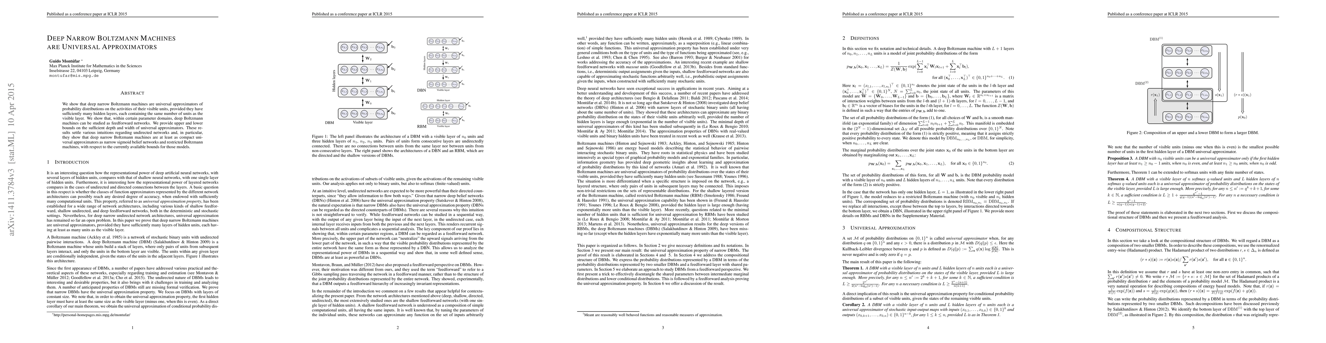 Deep narrow Boltzmann machines can approximate any probability distribution on their visible units with sufficient depth and width, functioning as universal approximators. These models are comparable in compactness to narrow sigmoid belief networks and restricted Boltzmann machines, according to current bounds.