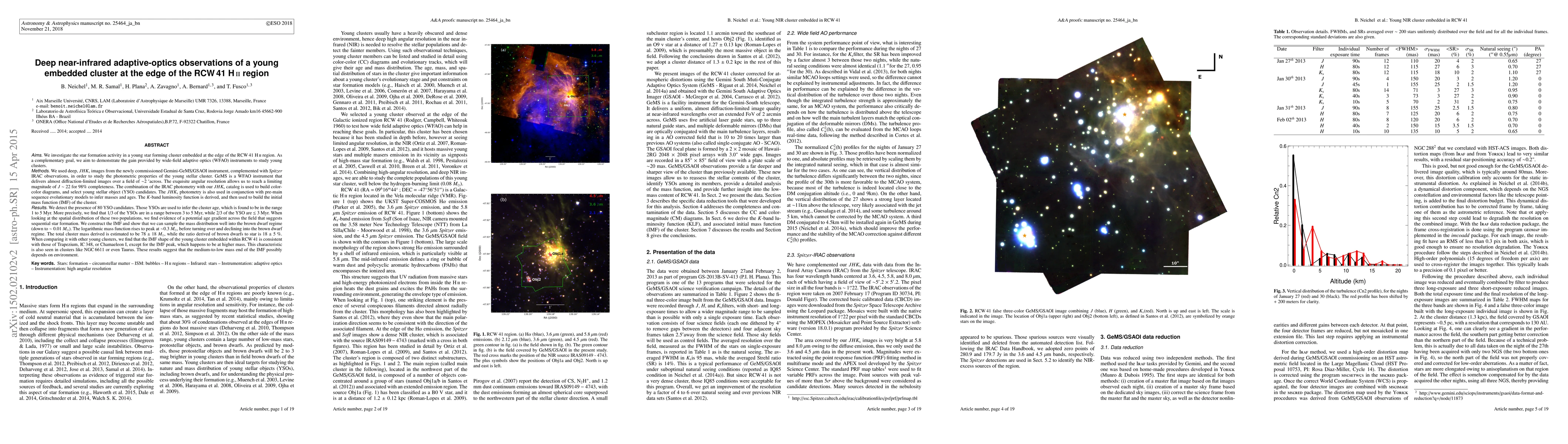 We investigate the star formation activity in a young star forming cluster embedded at the edge of the RCW 41 HII region. As a complementary goal, we aim at demonstrating the gain provided by Wide-Field Adaptive Optics instruments to study young clusters. We used deep, JHKs images from the newly commissioned Gemini-GeMS/GSAOI instrument, complemented with Spitzer IRAC observations, in order to study the photometric properties of the young stellar cluster. GeMS is an AO instrument, delivering almost diffraction limited images over a field of 2' across. The exquisite angular resolution allows us to reach a limiting magnitude of J = 22 for 98% completeness. The combination of the IRAC photometry with our JHKs catalog is used to build color-color diagrams, and select Young Stellar Objects (YSOs) candidates. We detect the presence of 80 Young Stellar Object (YSO) candidates. Those YSOs are used to infer the cluster age, which is found to be in the range 1 to 5 Myr. We find that 1/3 of the YSOs are in a range between 3 to 5 Myr, while 2/3 of the YSO are < 3 Myr. When looking at the spatial distribution of these two populations, we evidence a potential age gradient across the field, suggesting sequential star formation. We construct the IMF, and show that we can sample the mass distribution well into the brown dwarf regime (down to 0.01 Msun). The logarithmic mass function rises to peak at 0.3 Msun, before turning over and declining into the brown dwarf regime. The total cluster mass derived is estimated to be 78 +/- 18 Msun, while the ratio of brown dwarfs to star derived is 18 p/- 5 %. When comparing with other young clusters, we find that the IMF shape of the young cluster embedded within RCW 41 is consistent with those of Trapezium, IC 348 or Chamaeleon I, except for the IMF peak, which happens to be at higher mass. This characteristic is also seen in clusters like NGC 6611 or even Taurus.
