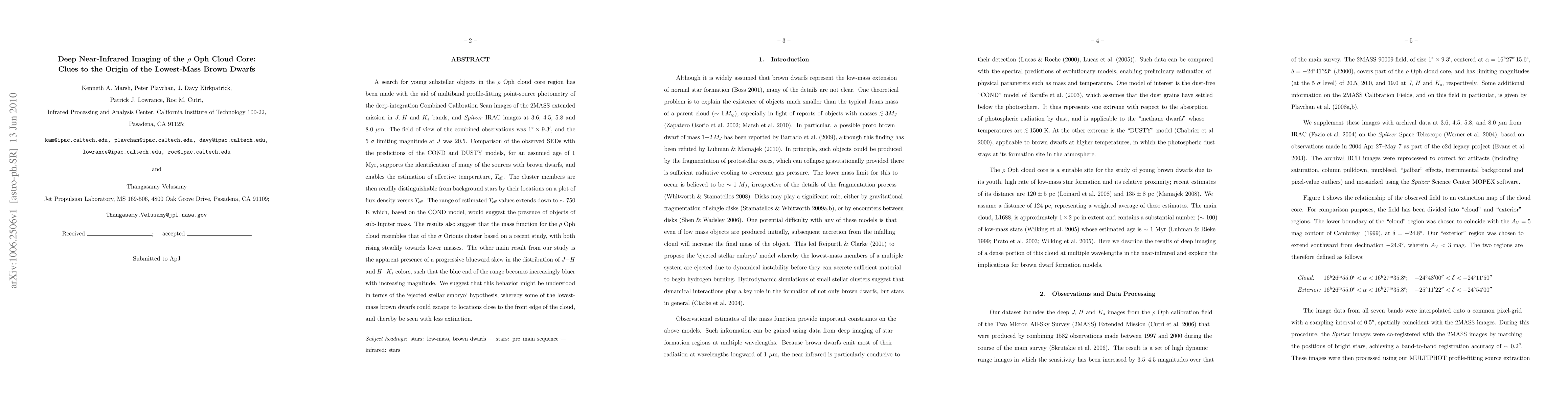 A search for young substellar objects in the rho Oph cloud core region has been made using the deep-integration Combined Calibration Scan images of the 2MASS extended mission in J, H and Ks bands, and Spitzer IRAC images at 3.6, 4.5, 5.8 and 8.0 microns. The field of view of the combined observations was 1 deg x 9.3 arcmin, and the 5 sigma limiting magnitude at J was 20.5. Comparison of the observed SEDs with the predictions of the COND and DUSTY models, for an assumed age of 1 Myr, supports the identification of many of the sources with brown dwarfs, and enables the estimation of effective temperature, Teff. The cluster members are then readily distinguishable from background stars by their locations on a plot of flux density versus Teff. The range of estimated Teff extends down to ~ 750 K, suggesting the presence of objects of sub-Jupiter mass. The results also suggest that the mass function for the rho Oph cloud resembles that of the sigma Orionis cluster based on a recent study, with both rising towards lower masses. The other main result from our study is the apparent presence of a progressive blueward skew in the distribution of J-H and H-Ks colors, such that the blue end of the range becomes increasingly bluer with increasing magnitude. We suggest that this behavior might be understood in terms of the 'ejected stellar embryo' hypothesis, whereby some of the lowest-mass brown dwarfs could escape to locations close to the front edge of the cloud, and thereby be seen with less extinction.