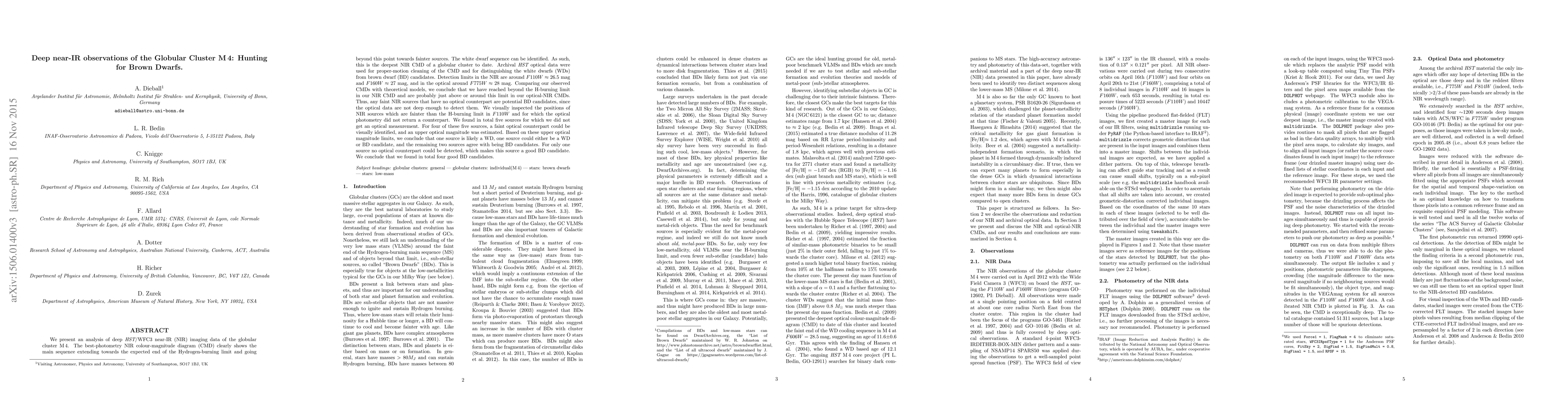 This study uses deep HST/WFC3 near-IR imaging to analyze the globular cluster M4, revealing a clear main sequence extending beyond the Hydrogen-burning limit. The research identified four potential brown dwarf candidates, with one source lacking an optical counterpart, making it a strong candidate for a brown dwarf.