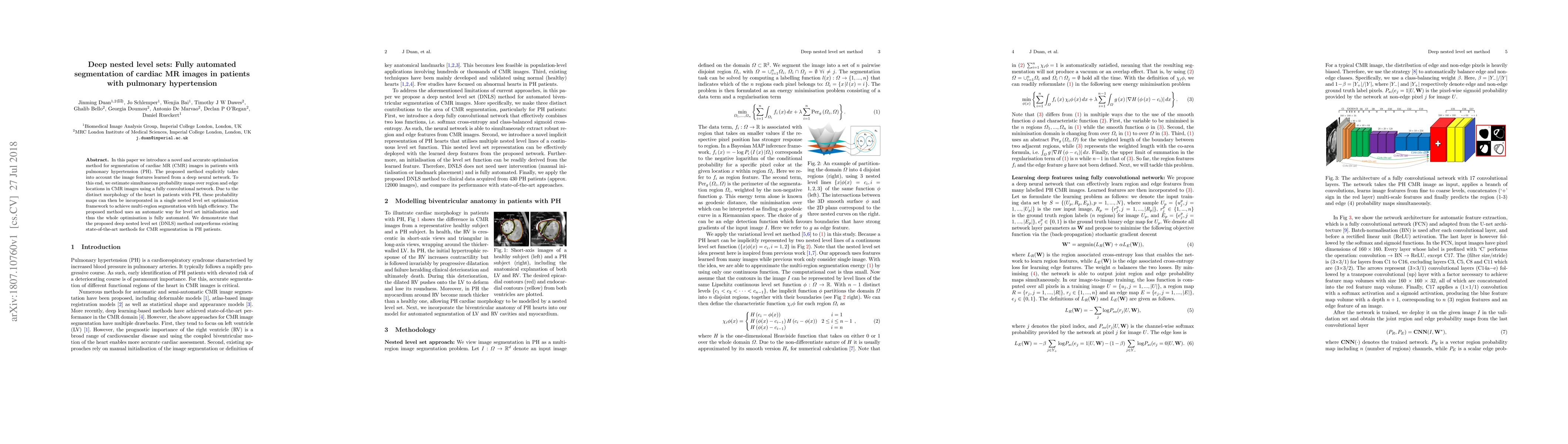 This paper proposes a deep nested level set (DNLS) method for fully automated segmentation of cardiac MR images in pulmonary hypertension patients, leveraging deep neural network features for accurate region and edge probability estimation, achieving superior segmentation performance compared to existing methods. The method includes automatic level set initialization, ensuring complete automation.