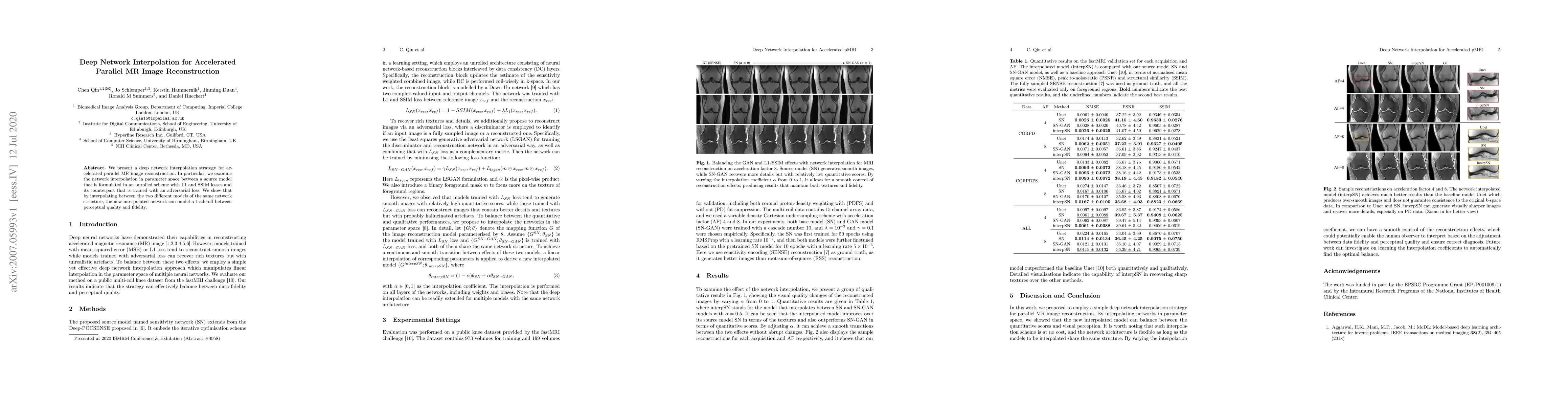 This paper introduces a deep network interpolation method to accelerate parallel MR image reconstruction, leveraging an unrolled scheme with L1 and SSIM losses and an adversarially trained model. The interpolation between these models balances perceptual quality and reconstruction fidelity.