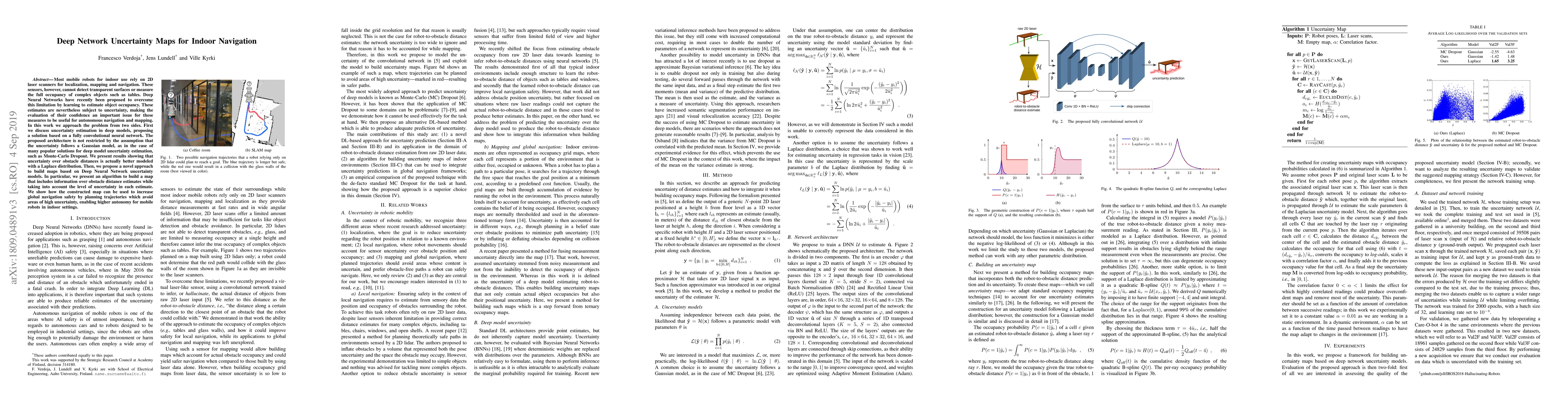 Most mobile robots for indoor use rely on 2D laser scanners for localization, mapping and navigation. These sensors, however, cannot detect transparent surfaces or measure the full occupancy of complex objects such as tables. Deep Neural Networks have recently been proposed to overcome this limitation by learning to estimate object occupancy. These estimates are nevertheless subject to uncertainty, making the evaluation of their confidence an important issue for these measures to be useful for autonomous navigation and mapping. In this work we approach the problem from two sides. First we discuss uncertainty estimation in deep models, proposing a solution based on a fully convolutional neural network. The proposed architecture is not restricted by the assumption that the uncertainty follows a Gaussian model, as in the case of many popular solutions for deep model uncertainty estimation, such as Monte-Carlo Dropout. We present results showing that uncertainty over obstacle distances is actually better modeled with a Laplace distribution. Then, we propose a novel approach to build maps based on Deep Neural Network uncertainty models. In particular, we present an algorithm to build a map that includes information over obstacle distance estimates while taking into account the level of uncertainty in each estimate. We show how the constructed map can be used to increase global navigation safety by planning trajectories which avoid areas of high uncertainty, enabling higher autonomy for mobile robots in indoor settings.