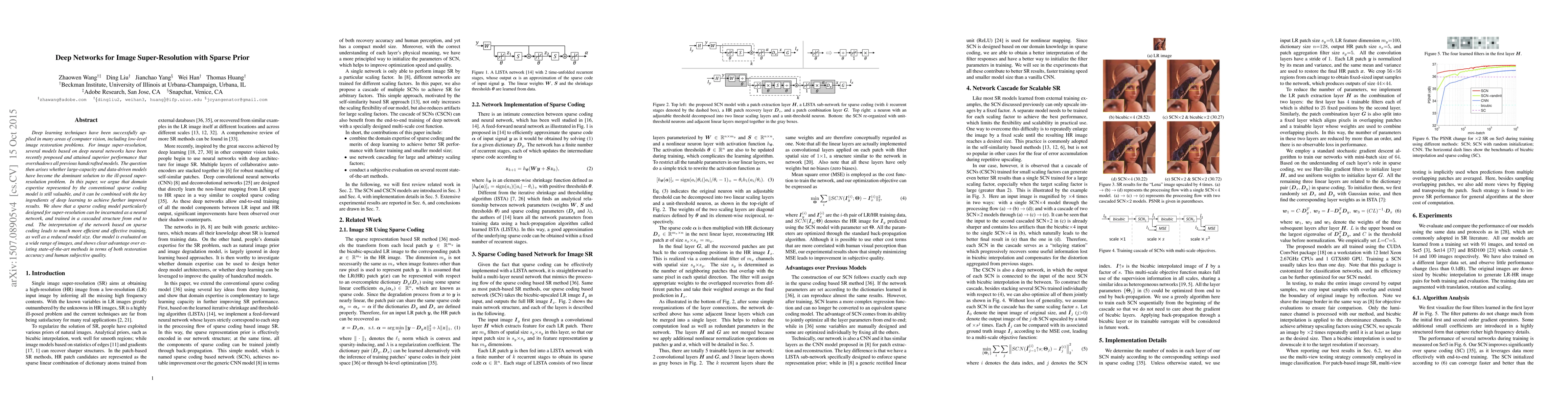 Deep learning techniques have been successfully applied in many areas of computer vision, including low-level image restoration problems. For image super-resolution, several models based on deep neural networks have been recently proposed and attained superior performance that overshadows all previous handcrafted models. The question then arises whether large-capacity and data-driven models have become the dominant solution to the ill-posed super-resolution problem. In this paper, we argue that domain expertise represented by the conventional sparse coding model is still valuable, and it can be combined with the key ingredients of deep learning to achieve further improved results. We show that a sparse coding model particularly designed for super-resolution can be incarnated as a neural network, and trained in a cascaded structure from end to end. The interpretation of the network based on sparse coding leads to much more efficient and effective training, as well as a reduced model size. Our model is evaluated on a wide range of images, and shows clear advantage over existing state-of-the-art methods in terms of both restoration accuracy and human subjective quality.