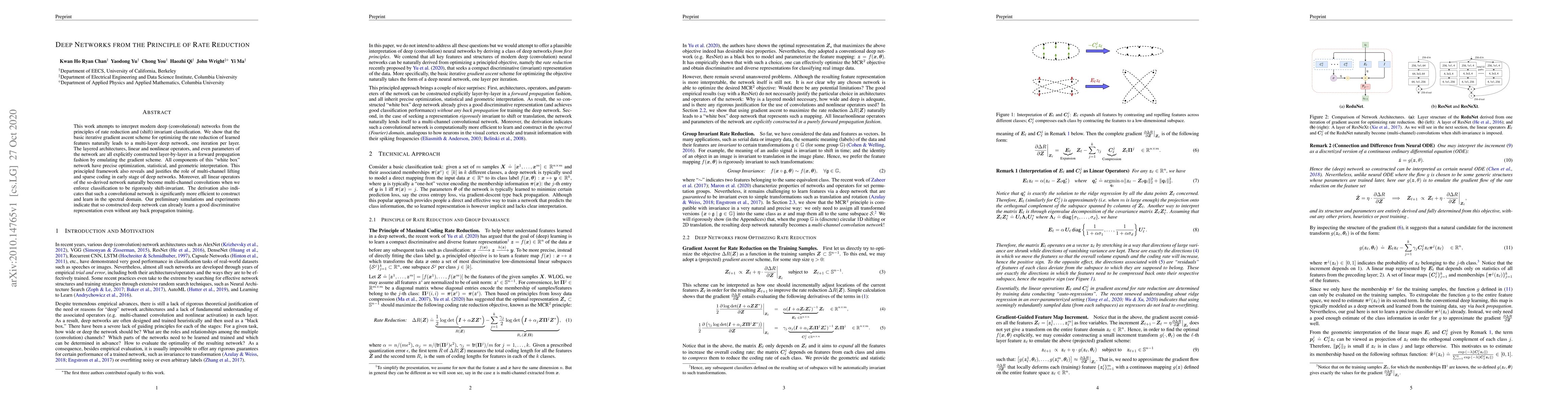 Researchers show that optimizing rate reduction in deep networks naturally leads to a multi-layered architecture with explicit construction of layers, operators, and parameters through iterative gradient ascent schemes. The framework reveals efficient construction and learning in the spectral domain, even without backpropagation training.