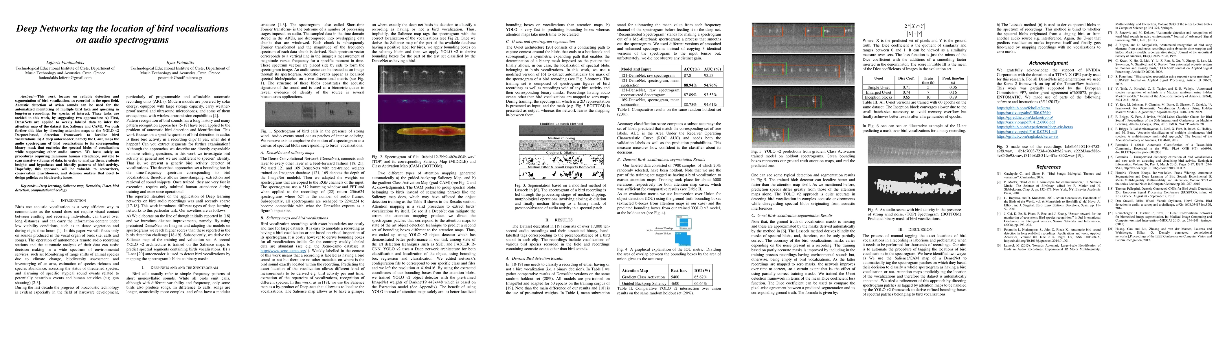 This work focuses on reliable detection and segmentation of bird vocalizations as recorded in the open field. Acoustic detection of avian sounds can be used for the automatized monitoring of multiple bird taxa and querying in long-term recordings for species of interest. These tasks are tackled in this work, by suggesting two approaches: A) First, DenseNets are applied to weekly labeled data to infer the attention map of the dataset (i.e. Salience and CAM). We push further this idea by directing attention maps to the YOLO v2 Deepnet-based, detection framework to localize bird vocalizations. B) A deep autoencoder, namely the U-net, maps the audio spectrogram of bird vocalizations to its corresponding binary mask that encircles the spectral blobs of vocalizations while suppressing other audio sources. We focus solely on procedures requiring minimum human attendance, suitable to scan massive volumes of data, in order to analyze them, evaluate insights and hypotheses and identify patterns of bird activity. Hopefully, this approach will be valuable to researchers, conservation practitioners, and decision makers that need to design policies on biodiversity issues.