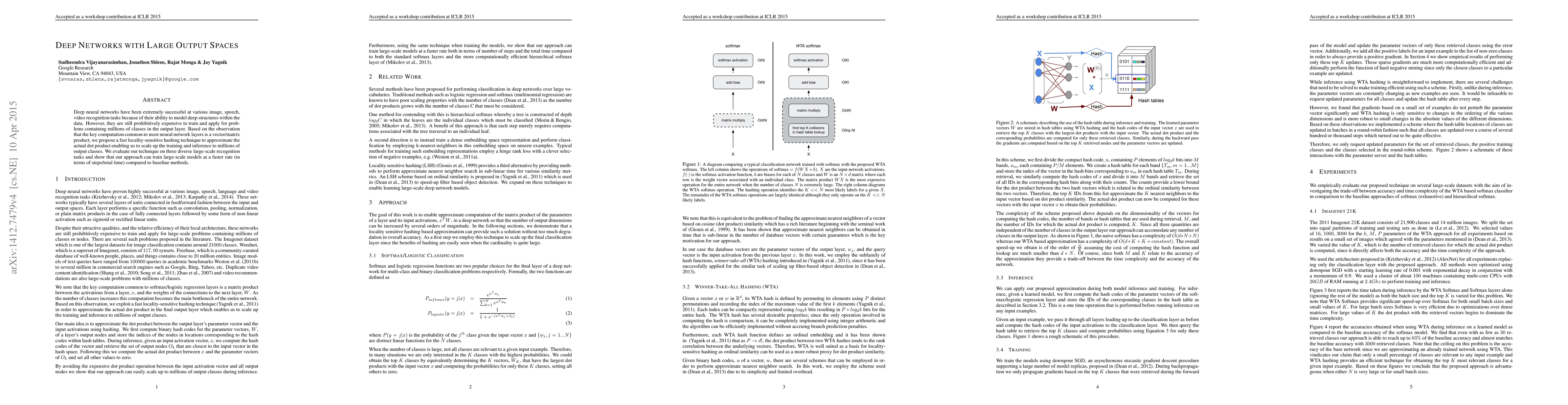 Deep neural networks have been extremely successful at various image, speech, video recognition tasks because of their ability to model deep structures within the data. However, they are still prohibitively expensive to train and apply for problems containing millions of classes in the output layer. Based on the observation that the key computation common to most neural network layers is a vector/matrix product, we propose a fast locality-sensitive hashing technique to approximate the actual dot product enabling us to scale up the training and inference to millions of output classes. We evaluate our technique on three diverse large-scale recognition tasks and show that our approach can train large-scale models at a faster rate (in terms of steps/total time) compared to baseline methods.