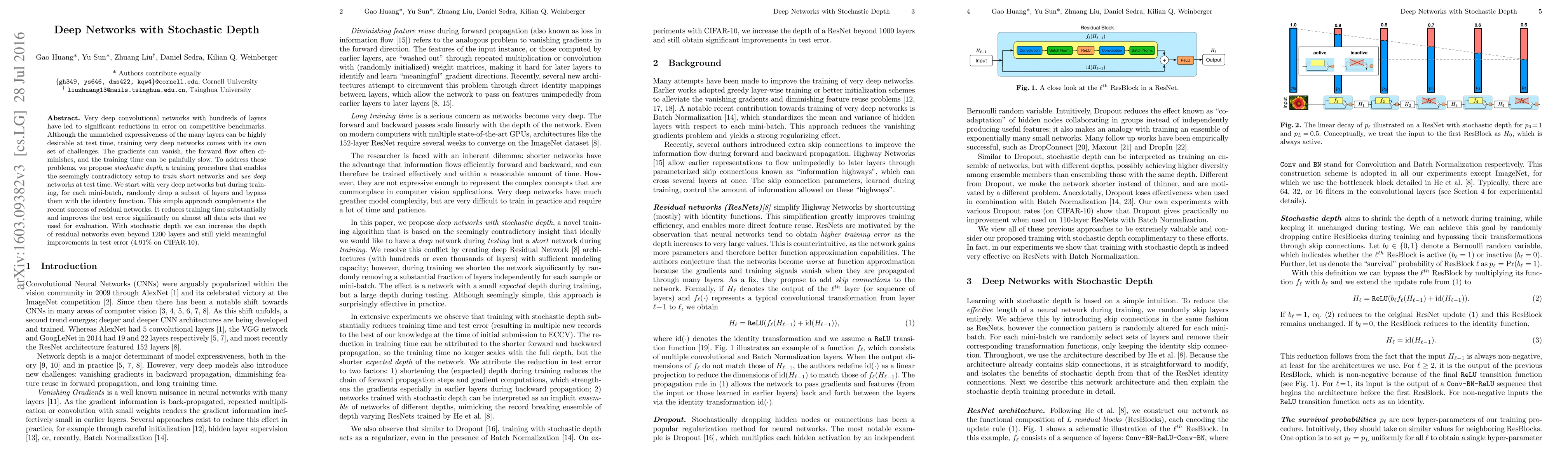 Very deep convolutional networks with hundreds of layers have led to significant reductions in error on competitive benchmarks. Although the unmatched expressiveness of the many layers can be highly desirable at test time, training very deep networks comes with its own set of challenges. The gradients can vanish, the forward flow often diminishes, and the training time can be painfully slow. To address these problems, we propose stochastic depth, a training procedure that enables the seemingly contradictory setup to train short networks and use deep networks at test time. We start with very deep networks but during training, for each mini-batch, randomly drop a subset of layers and bypass them with the identity function. This simple approach complements the recent success of residual networks. It reduces training time substantially and improves the test error significantly on almost all data sets that we used for evaluation. With stochastic depth we can increase the depth of residual networks even beyond 1200 layers and still yield meaningful improvements in test error (4.91% on CIFAR-10).