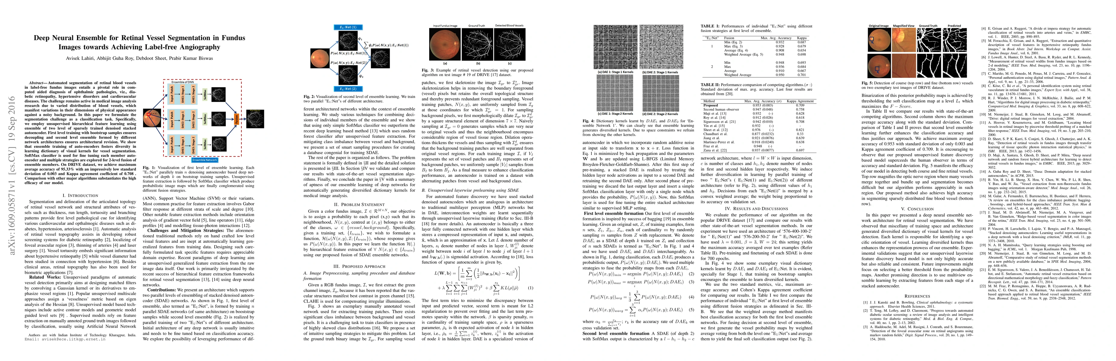 This paper proposes a deep neural ensemble approach using unsupervised hierarchical feature learning with stacked autoencoders to segment retinal blood vessels in fundus images, achieving high accuracy and low variability. The ensemble method enhances the diversity of learned visual kernels, leading to superior performance compared to other algorithms.