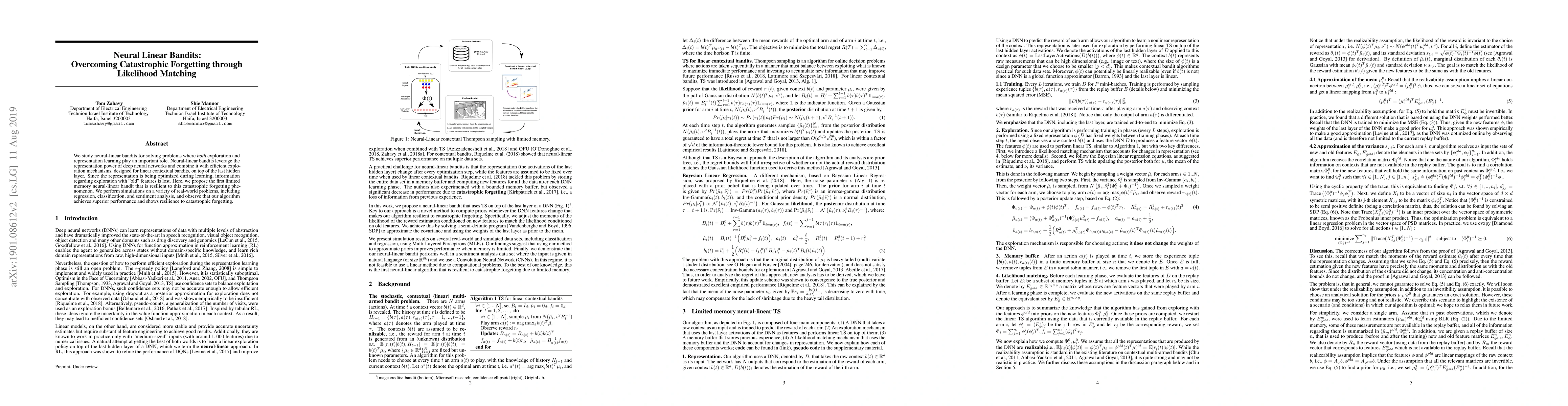 We study the neural-linear bandit model for solving sequential decision-making problems with high dimensional side information. Neural-linear bandits leverage the representation power of deep neural networks and combine it with efficient exploration mechanisms, designed for linear contextual bandits, on top of the last hidden layer. Since the representation is being optimized during learning, information regarding exploration with "old" features is lost. Here, we propose the first limited memory neural-linear bandit that is resilient to this phenomenon, which we term catastrophic forgetting. We evaluate our method on a variety of real-world data sets, including regression, classification, and sentiment analysis, and observe that our algorithm is resilient to catastrophic forgetting and achieves superior performance.
