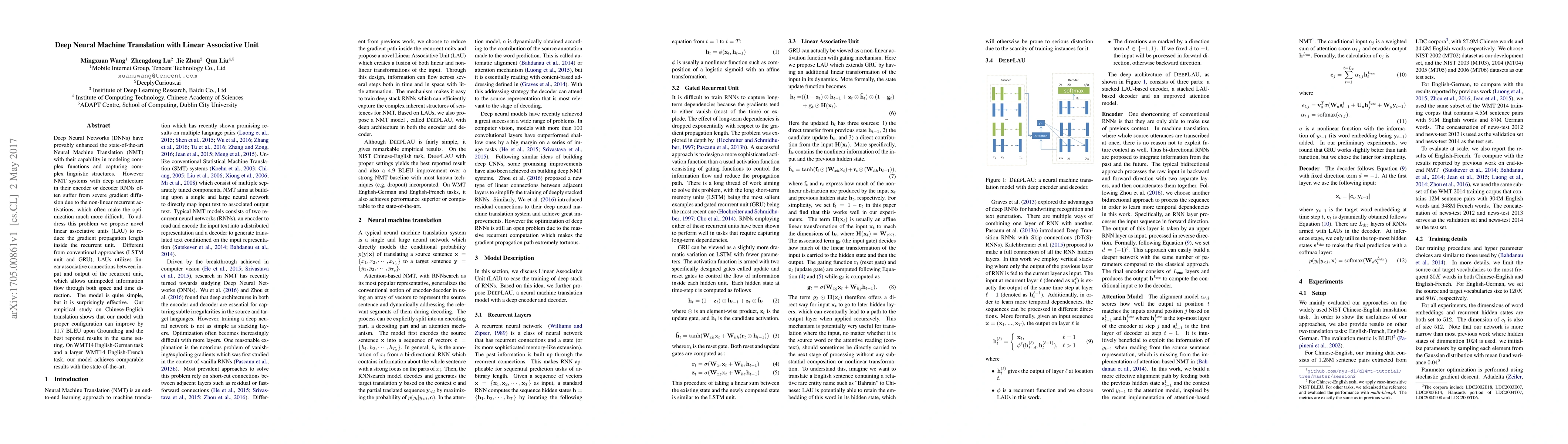 This paper proposes linear associative units (LAUs) to mitigate gradient diffusion in deep neural networks for neural machine translation, achieving significant improvements in translation quality. Empirical studies show an 11.7 BLEU score increase over existing models in Chinese-English translation and competitive results on English-German and English-French tasks.