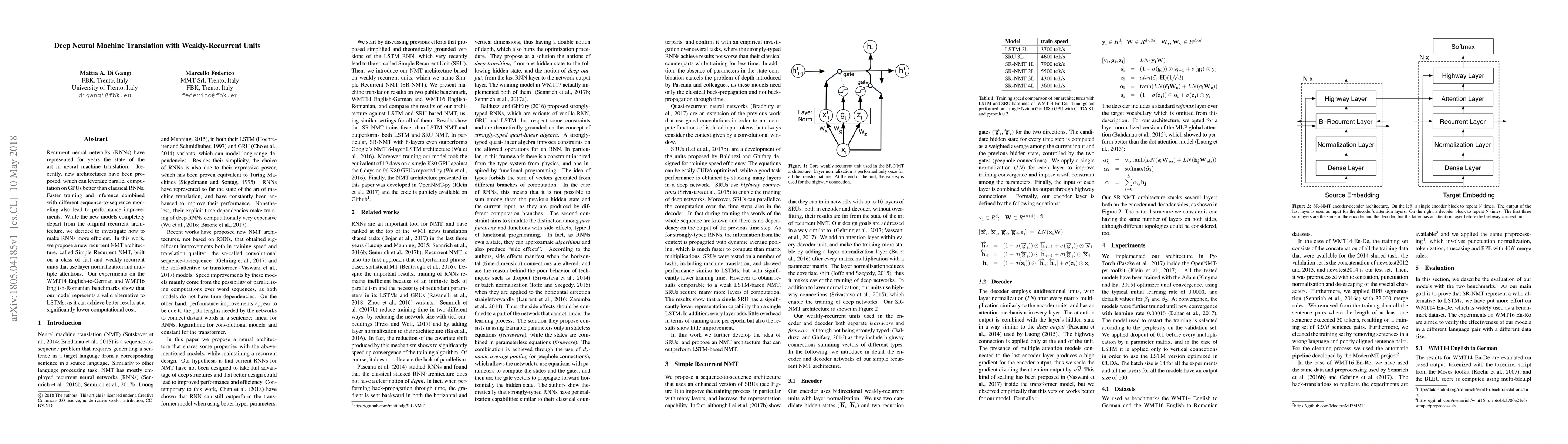 This paper proposes Simple Recurrent NMT, a new neural machine translation architecture that uses weakly-recurrent units with layer normalization and multiple attentions. Experiments on WMT benchmarks show that it achieves better results than LSTMs at a lower computational cost.