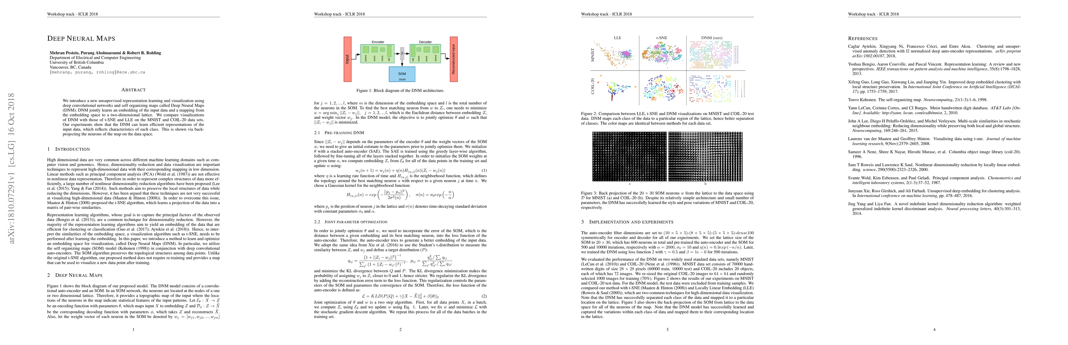 We introduce a new unsupervised representation learning and visualization using deep convolutional networks and self organizing maps called Deep Neural Maps (DNM). DNM jointly learns an embedding of the input data and a mapping from the embedding space to a two-dimensional lattice. We compare visualizations of DNM with those of t-SNE and LLE on the MNIST and COIL-20 data sets. Our experiments show that the DNM can learn efficient representations of the input data, which reflects characteristics of each class. This is shown via back-projecting the neurons of the map on the data space.