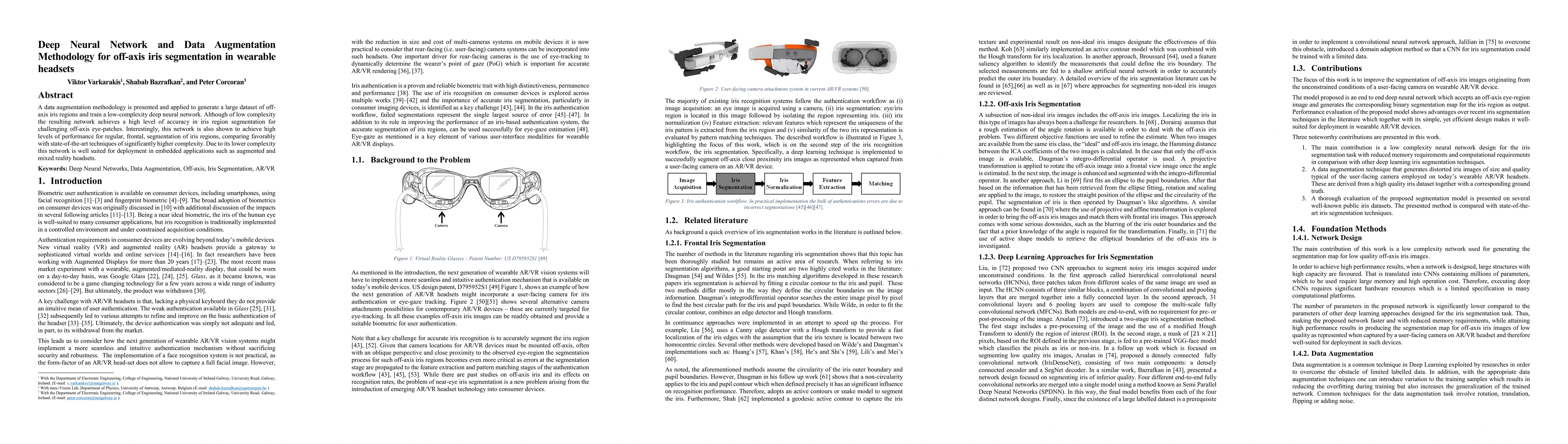 A low-complexity deep neural network trained with a data augmentation methodology achieves high accuracy in iris region segmentation for both off-axis and frontal images, making it suitable for deployment in wearable headsets.