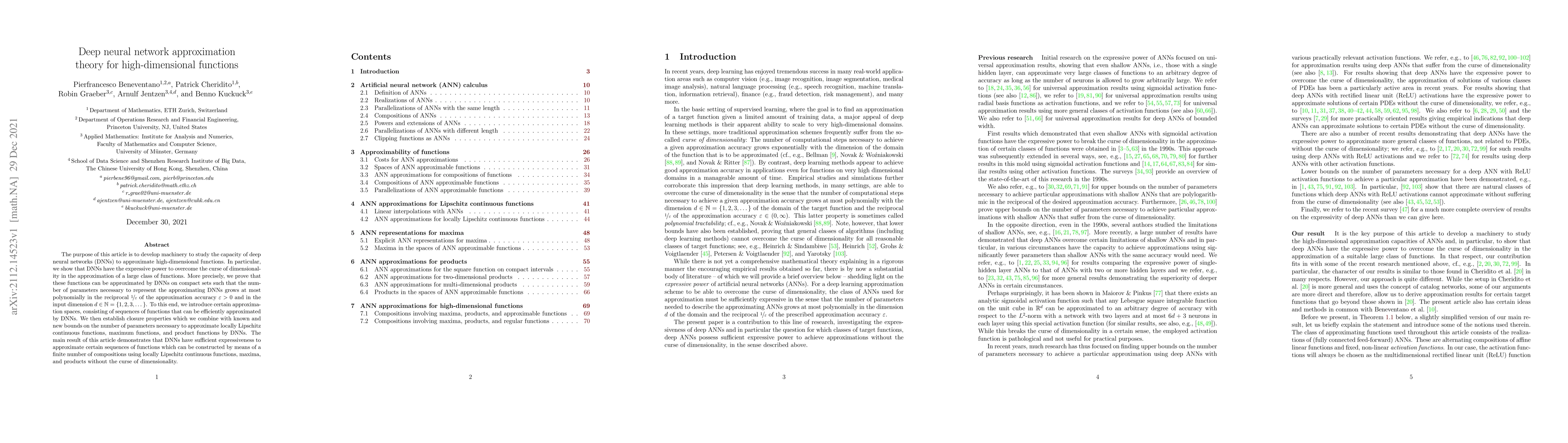 This paper develops theoretical foundations to show that deep neural networks can effectively approximate high-dimensional functions, overcoming the curse of dimensionality. It proves that the number of parameters required for such approximations grows polynomially with the desired accuracy and input dimension.