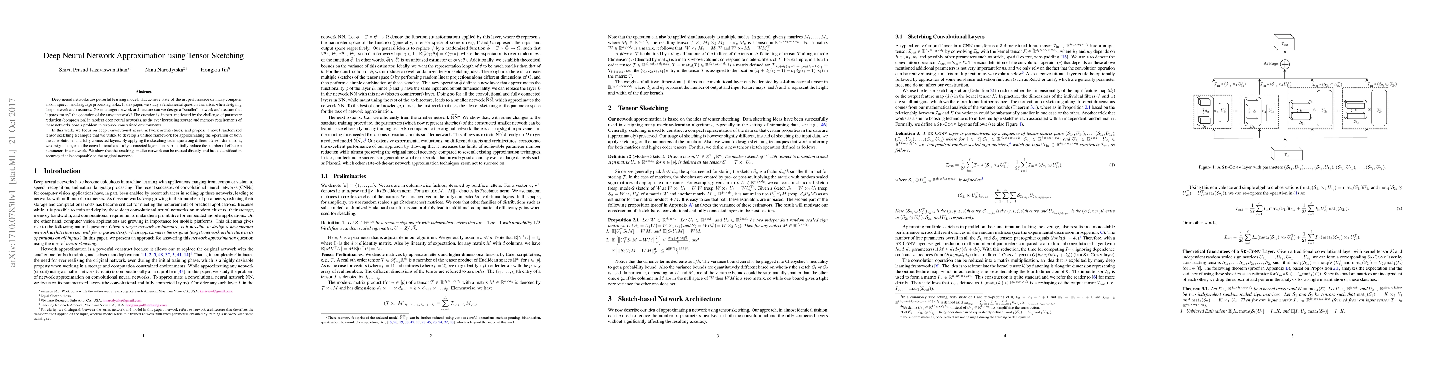 This paper proposes a novel tensor sketching technique to approximate deep convolutional neural networks, significantly reducing the number of parameters while maintaining comparable classification accuracy. The method aims to address the challenge of parameter reduction in resource-constrained environments.