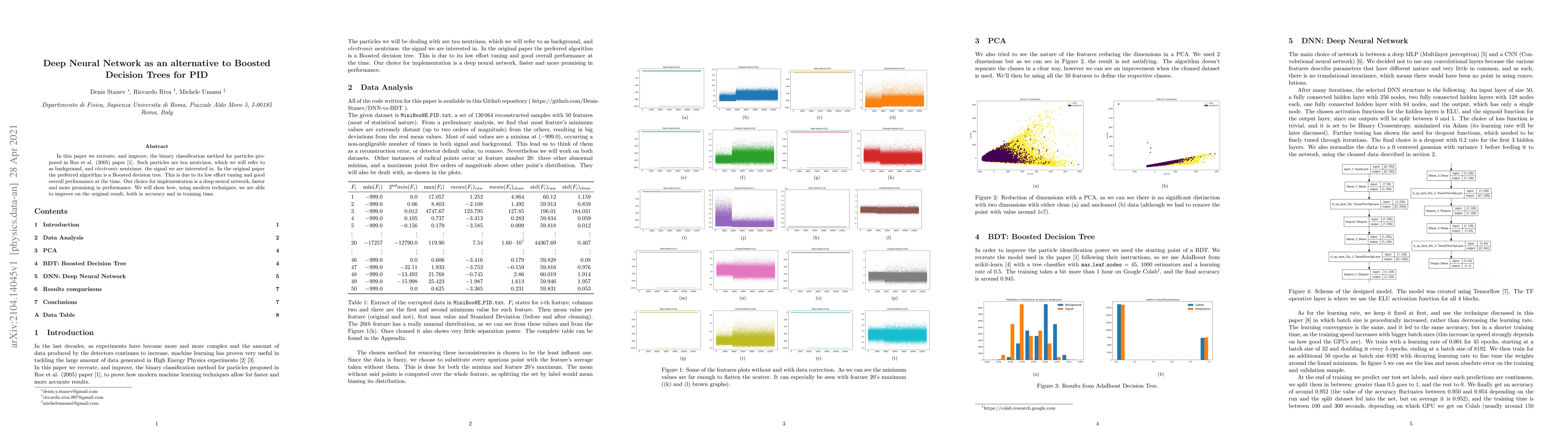 In this paper we recreate, and improve, the binary classification method for particles proposed in Roe et al. (2005) paper "Boosted decision trees as an alternative to artificial neural networks for particle identification". Such particles are tau neutrinos, which we will refer to as background, and electronic neutrinos: the signal we are interested in. In the original paper the preferred algorithm is a Boosted decision tree. This is due to its low effort tuning and good overall performance at the time. Our choice for implementation is a deep neural network, faster and more promising in performance. We will show how, using modern techniques, we are able to improve on the original result, both in accuracy and in training time.