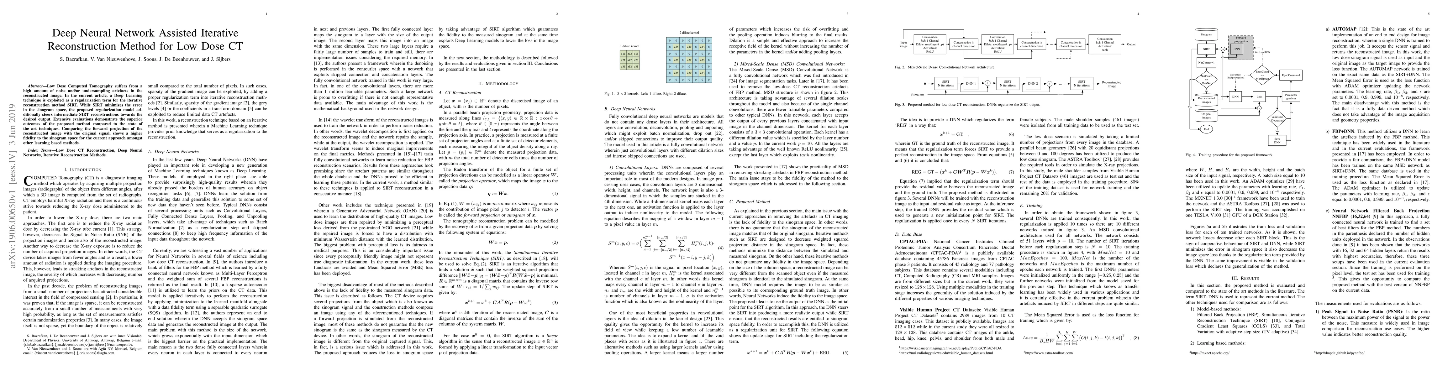 Low Dose Computed Tomography suffers from a high amount of noise and/or undersampling artefacts in the reconstructed image. In the current article, a Deep Learning technique is exploited as a regularization term for the iterative reconstruction method SIRT. While SIRT minimizes the error in the sinogram space, the proposed regularization model additionally steers intermediate SIRT reconstructions towards the desired output. Extensive evaluations demonstrate the superior outcomes of the proposed method compared to the state of the art techniques. Comparing the forward projection of the reconstructed image with the original signal shows a higher fidelity to the sinogram space for the current approach amongst other learning based methods.
