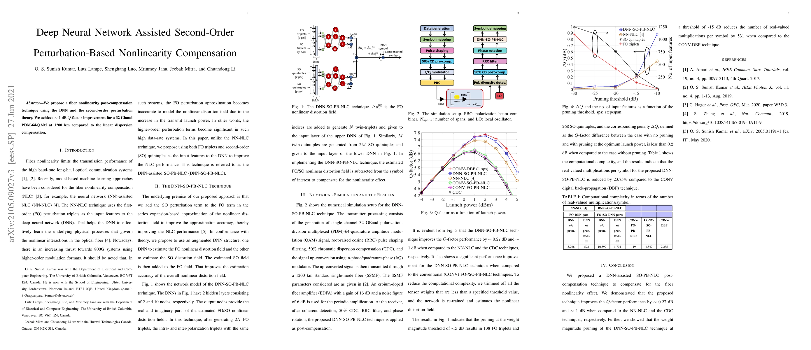 Summary: This paper introduces a deep neural network (DNN) assisted second-order perturbation-based technique for fiber nonlinearity compensation, achieving a 1 dB Q-factor improvement over linear dispersion compensation for 32 Gbaud PDM-64-QAM over 1200 km.