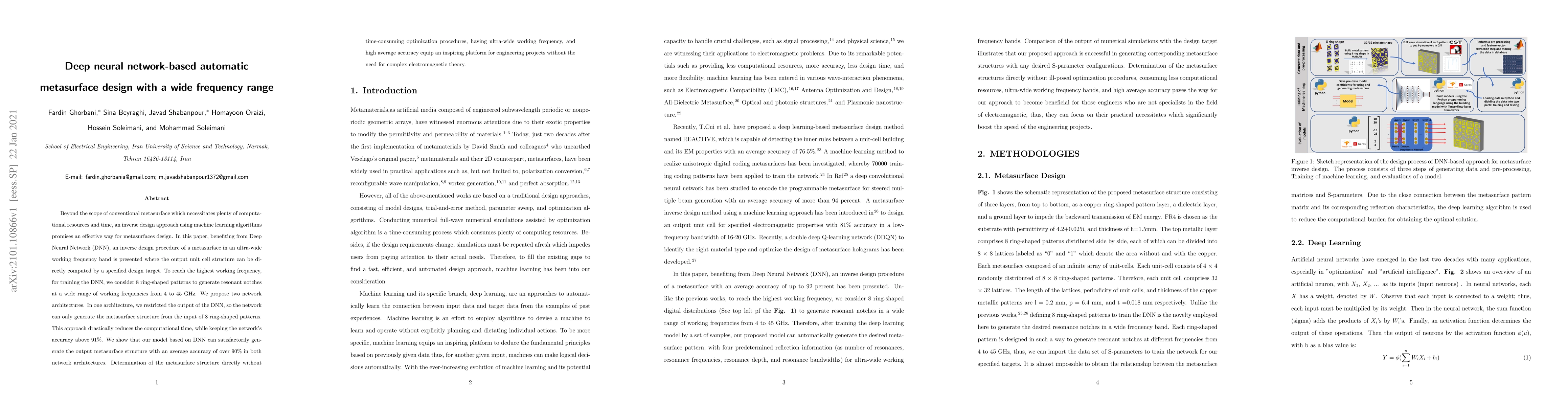 Beyond the scope of conventional metasurface which necessitates plenty of computational resources and time, an inverse design approach using machine learning algorithms promises an effective way for metasurfaces design. In this paper, benefiting from Deep Neural Network (DNN), an inverse design procedure of a metasurface in an ultra-wide working frequency band is presented where the output unit cell structure can be directly computed by a specified design target. To reach the highest working frequency, for training the DNN, we consider 8 ring-shaped patterns to generate resonant notches at a wide range of working frequencies from 4 to 45 GHz. We propose two network architectures. In one architecture, we restricted the output of the DNN, so the network can only generate the metasurface structure from the input of 8 ring-shaped patterns. This approach drastically reduces the computational time, while keeping the network's accuracy above 91\%. We show that our model based on DNN can satisfactorily generate the output metasurface structure with an average accuracy of over 90\% in both network architectures. Determination of the metasurface structure directly without time-consuming optimization procedures, having an ultra-wide working frequency, and high average accuracy equip an inspiring platform for engineering projects without the need for complex electromagnetic theory.