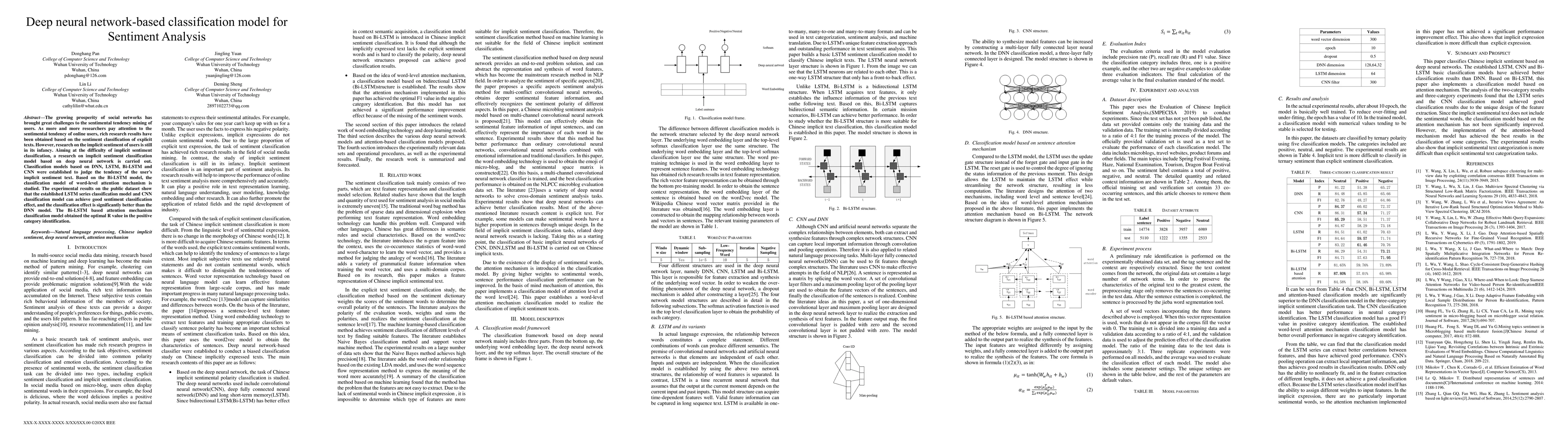 The research establishes and compares deep neural network-based classification models, including DNN, LSTM, Bi-LSTM, and CNN, for implicit sentiment analysis in Chinese texts. A word-level attention mechanism is implemented based on Bi-LSTM to improve classification performance.