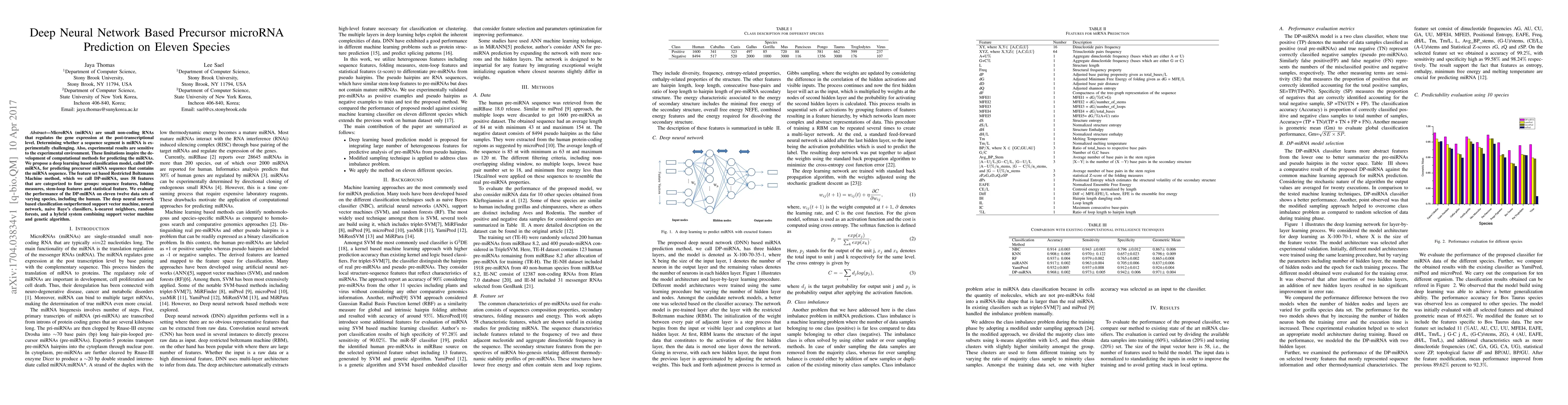 This paper proposes a deep learning model named DP-miRNA for predicting precursor microRNA sequences across eleven species. The model, which outperforms several traditional classifiers, uses a feature set derived from sequence, folding, stem-loop, and statistical characteristics.