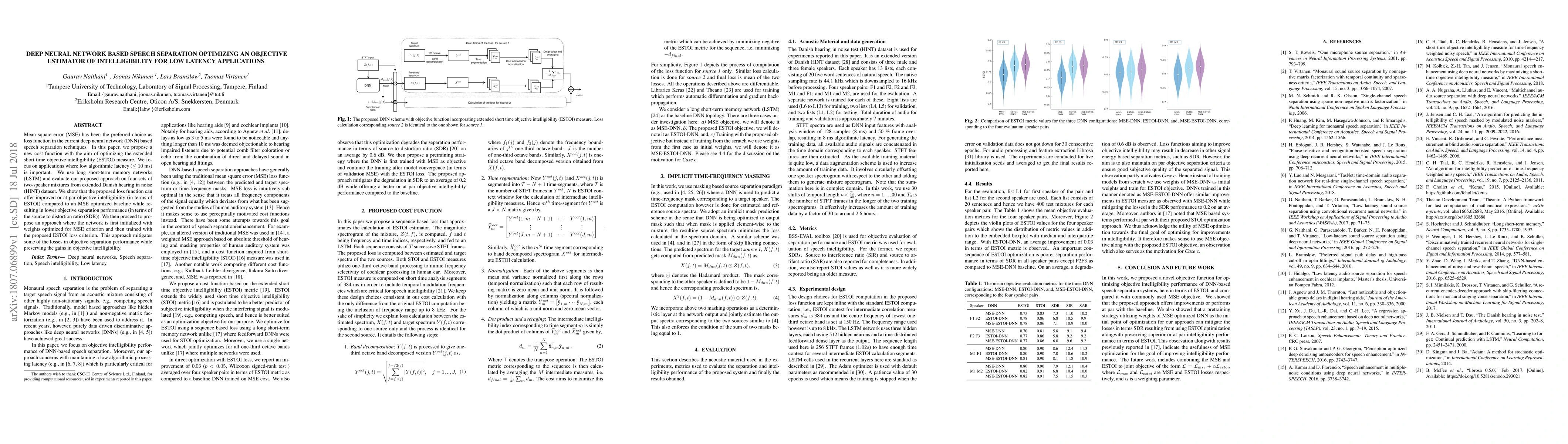 This paper proposes a new cost function based on the ESTOI measure for deep neural network-based speech separation, aiming to optimize intelligibility for low latency applications. The approach shows improved intelligibility compared to MSE-optimized baselines, though with some loss in separation performance, which is mitigated by initializing the network with MSE-optimized weights.