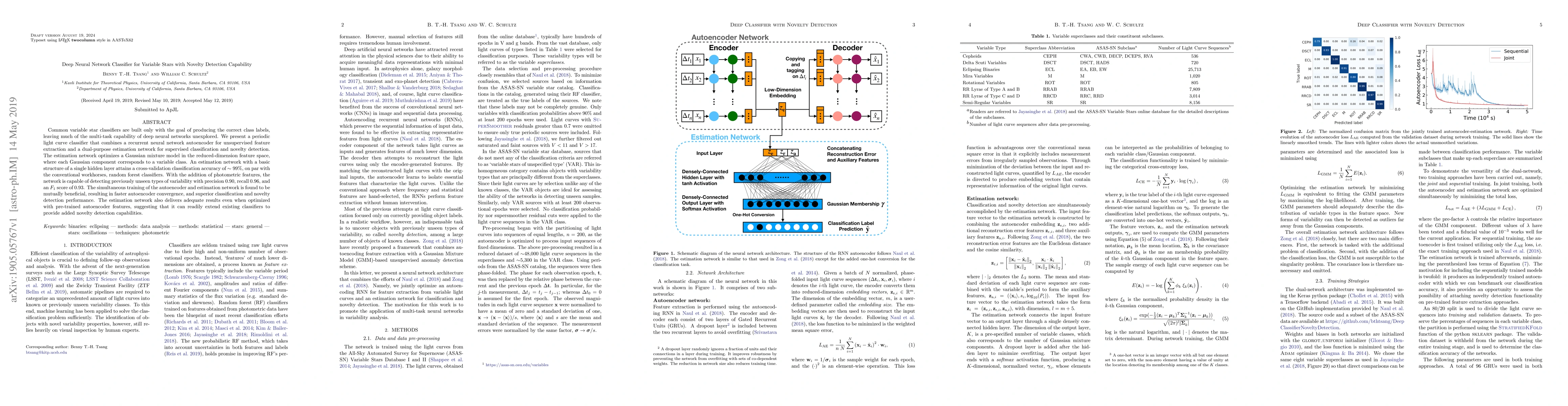 This paper introduces a deep neural network classifier for variable stars, utilizing a recurrent autoencoder for feature extraction and an estimation network for classification and novelty detection. The network achieves high classification accuracy and effectively identifies new types of variability, demonstrating the multi-task potential of deep learning.