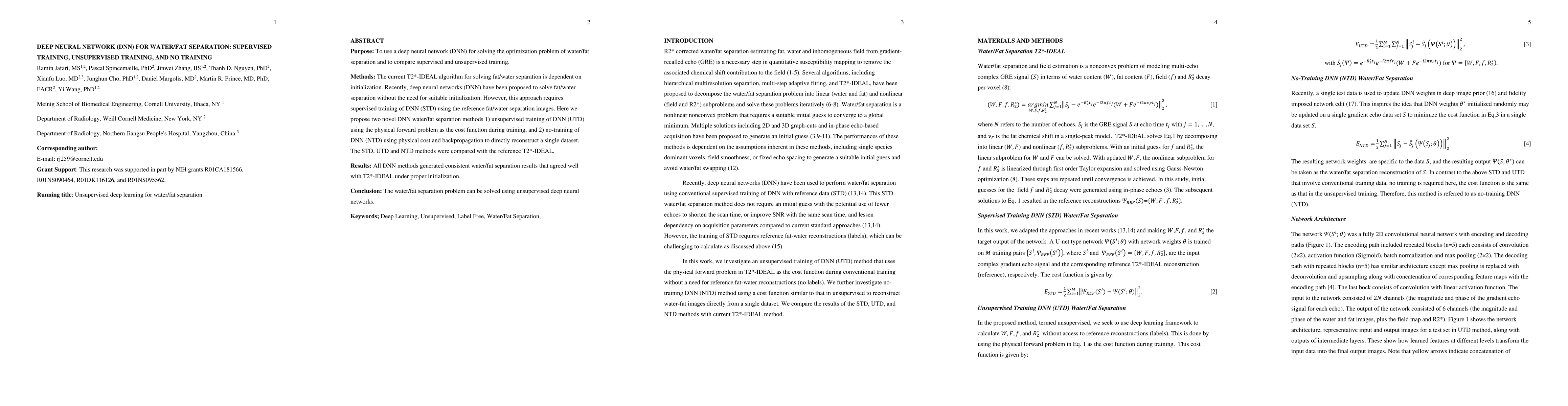 This paper proposes three deep neural network (DNN) methods for water/fat separation: supervised training (STD), unsupervised training (UTD), and no-training (NTD). The results show that all DNN methods performed comparably to the reference T2*-IDEAL algorithm, indicating that unsupervised training can effectively solve the water/fat separation problem.