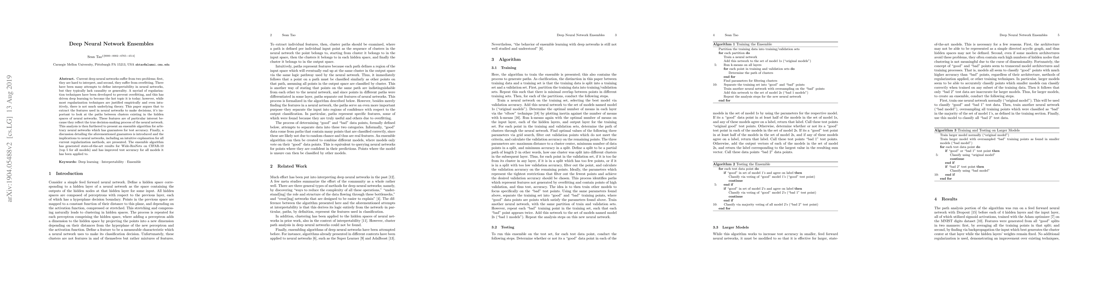 A new ensemble algorithm for deep neural networks improves test accuracy by analyzing paths between clusters in hidden spaces, achieving state-of-the-art results on Wide-ResNets on CIFAR-10.