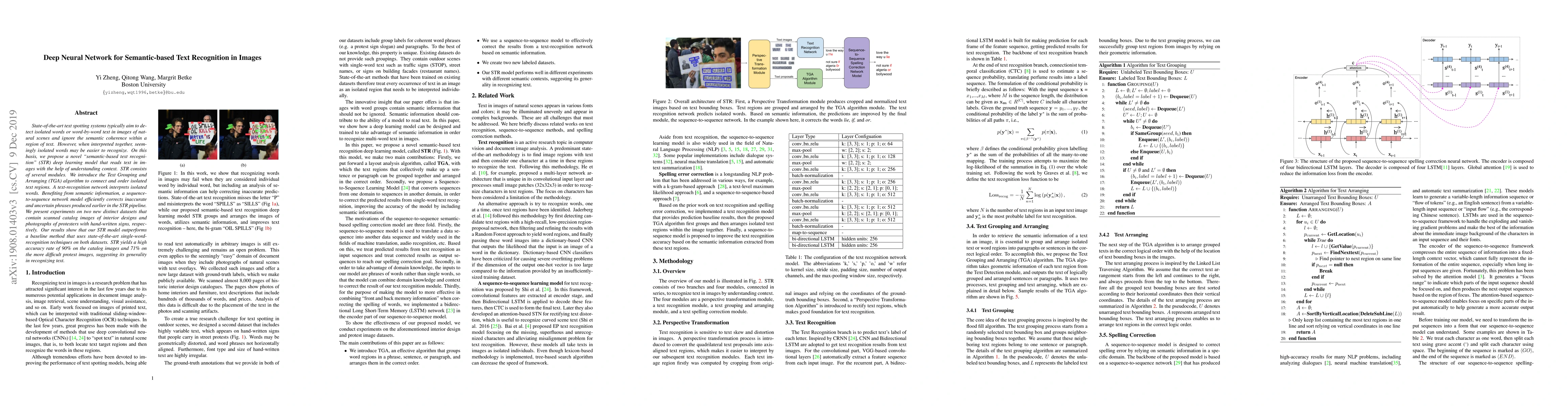 This paper proposes a "semantic-based text recognition" (STR) model to improve text spotting in images by considering contextual coherence. The STR model uses a Text Grouping and Arranging algorithm to connect isolated text regions and a sequence-to-sequence network to correct phrases, achieving 90% accuracy on catalog images and 71% on protest sign images.