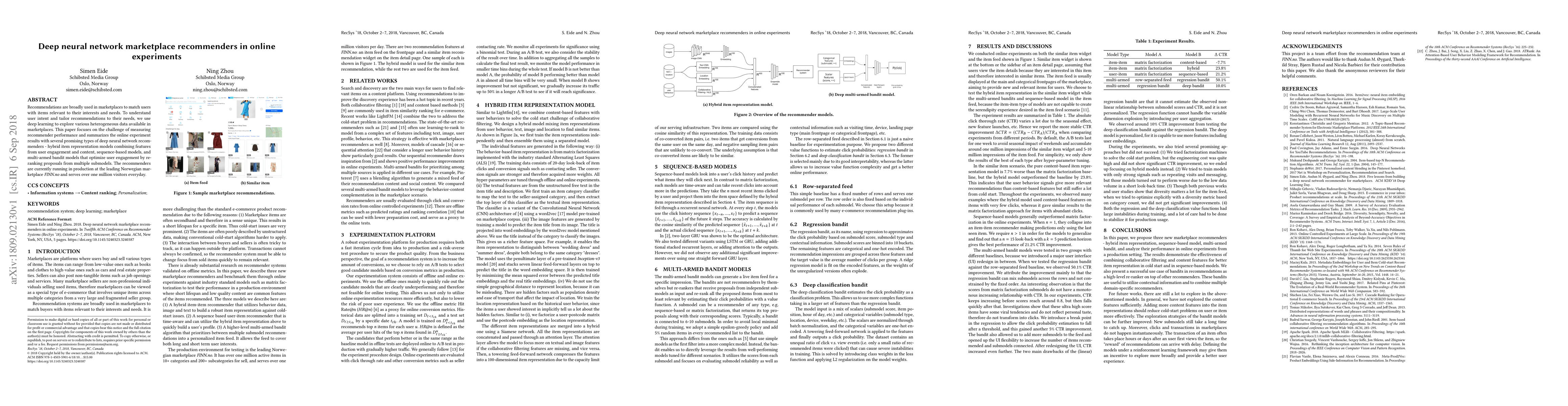 The paper proposes and analyzes three new marketplace recommenders - hybrid item representation, sequence-based, and multi-armed bandit models - in an online experiment setting from a production perspective.