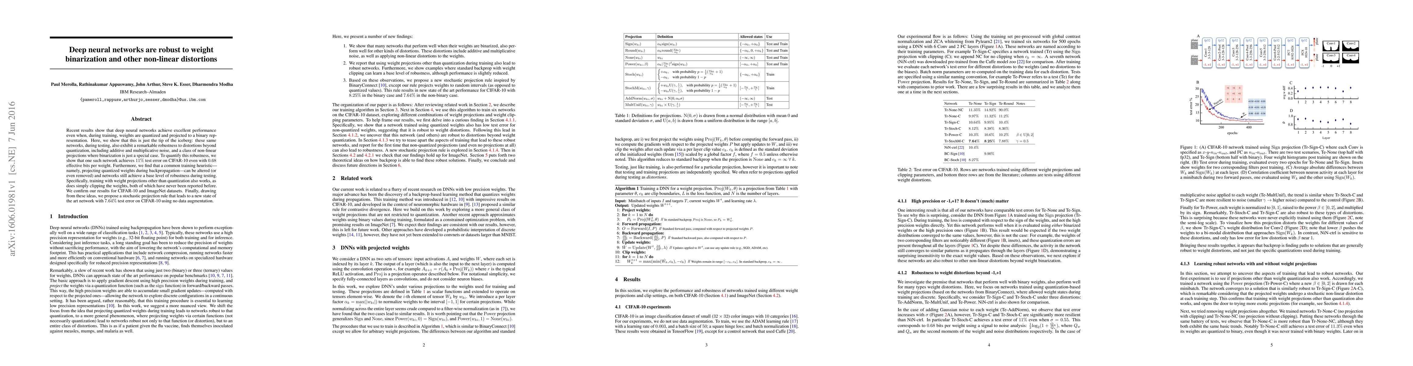 This paper demonstrates that deep neural networks maintain high performance even under significant weight binarization and various non-linear distortions, achieving 11% test error on CIFAR-10 with minimal effective bits per weight. The study also reveals that training methods beyond traditional quantization, such as clipping weights, can still yield robust networks, leading to a new state-of-the-art model on CIFAR-10.