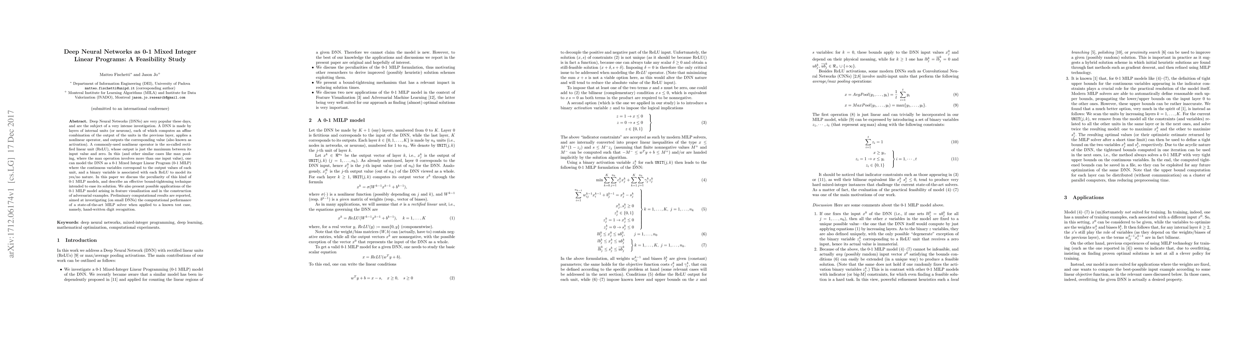 Deep Neural Networks (DNNs) are very popular these days, and are the subject of a very intense investigation. A DNN is made by layers of internal units (or neurons), each of which computes an affine combination of the output of the units in the previous layer, applies a nonlinear operator, and outputs the corresponding value (also known as activation). A commonly-used nonlinear operator is the so-called rectified linear unit (ReLU), whose output is just the maximum between its input value and zero. In this (and other similar cases like max pooling, where the max operation involves more than one input value), one can model the DNN as a 0-1 Mixed Integer Linear Program (0-1 MILP) where the continuous variables correspond to the output values of each unit, and a binary variable is associated with each ReLU to model its yes/no nature. In this paper we discuss the peculiarity of this kind of 0-1 MILP models, and describe an effective bound-tightening technique intended to ease its solution. We also present possible applications of the 0-1 MILP model arising in feature visualization and in the construction of adversarial examples. Preliminary computational results are reported, aimed at investigating (on small DNNs) the computational performance of a state-of-the-art MILP solver when applied to a known test case, namely, hand-written digit recognition.