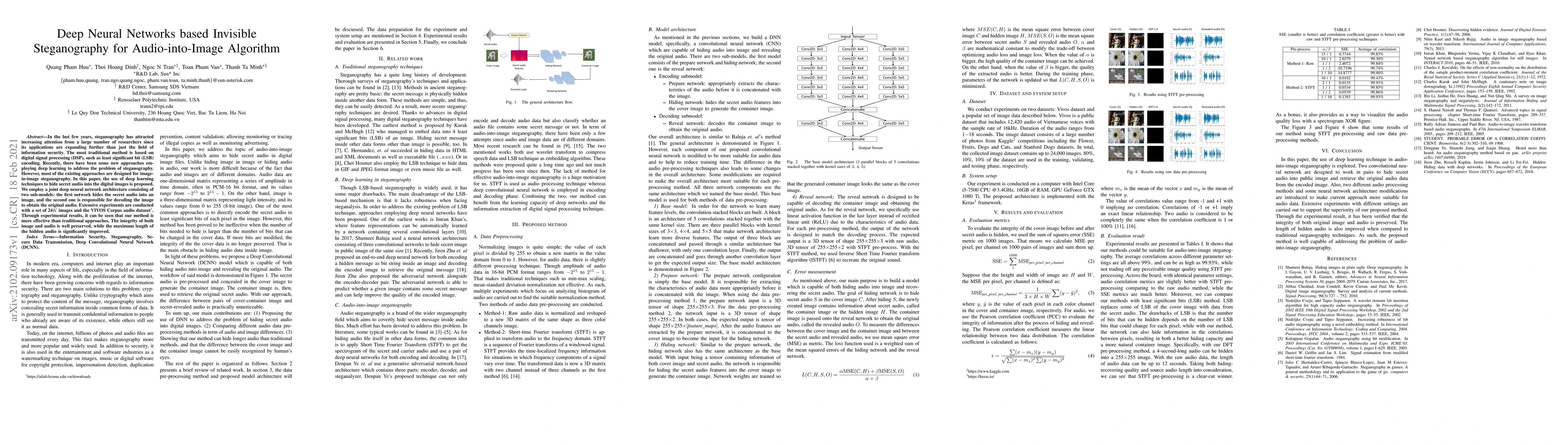 In the last few years, steganography has attracted increasing attention from a large number of researchers since its applications are expanding further than just the field of information security. The most traditional method is based on digital signal processing, such as least significant bit encoding. Recently, there have been some new approaches employing deep learning to address the problem of steganography. However, most of the existing approaches are designed for image-in-image steganography. In this paper, the use of deep learning techniques to hide secret audio into the digital images is proposed. We employ a joint deep neural network architecture consisting of two sub-models: the first network hides the secret audio into an image, and the second one is responsible for decoding the image to obtain the original audio. Extensive experiments are conducted with a set of 24K images and the VIVOS Corpus audio dataset. Through experimental results, it can be seen that our method is more effective than traditional approaches. The integrity of both image and audio is well preserved, while the maximum length of the hidden audio is significantly improved.